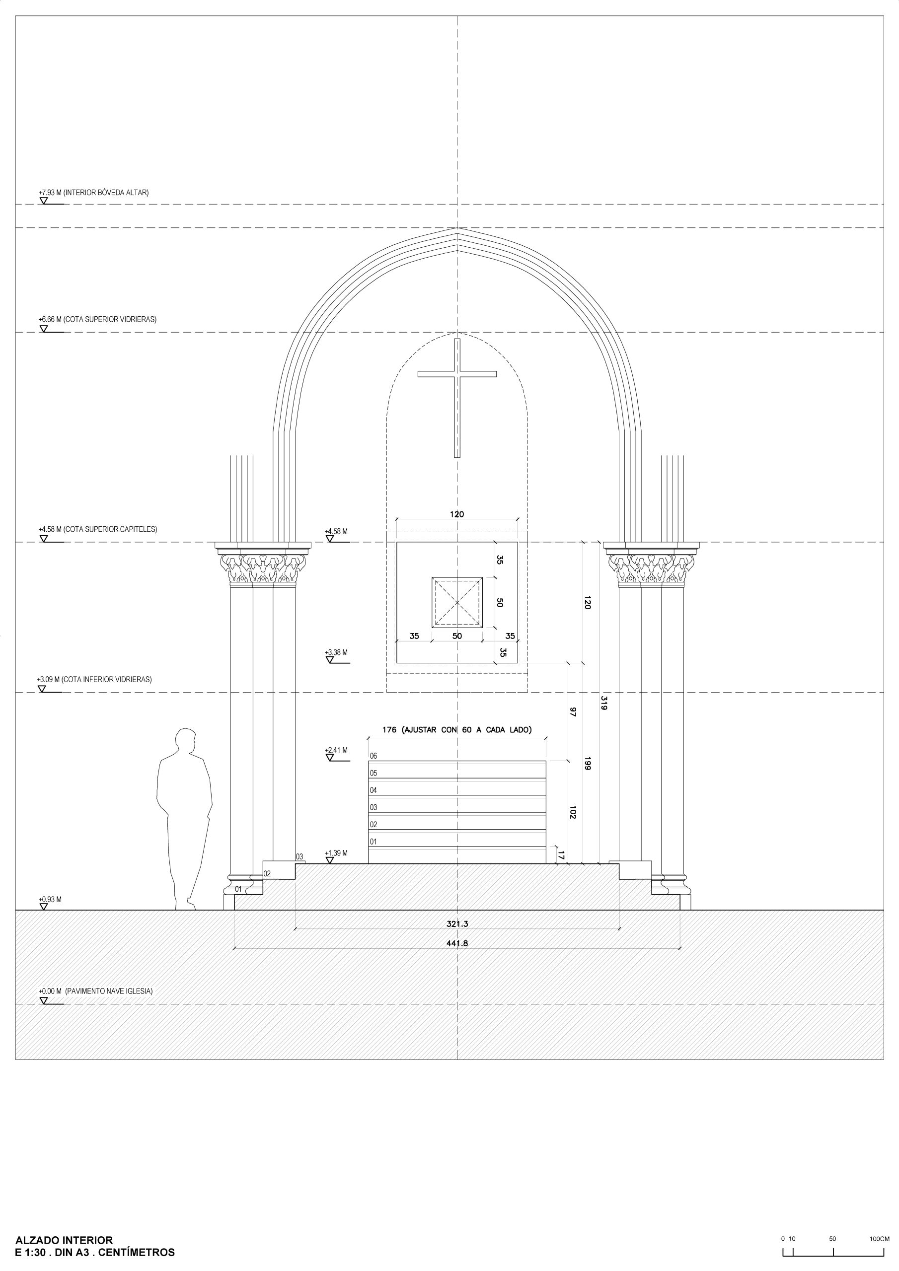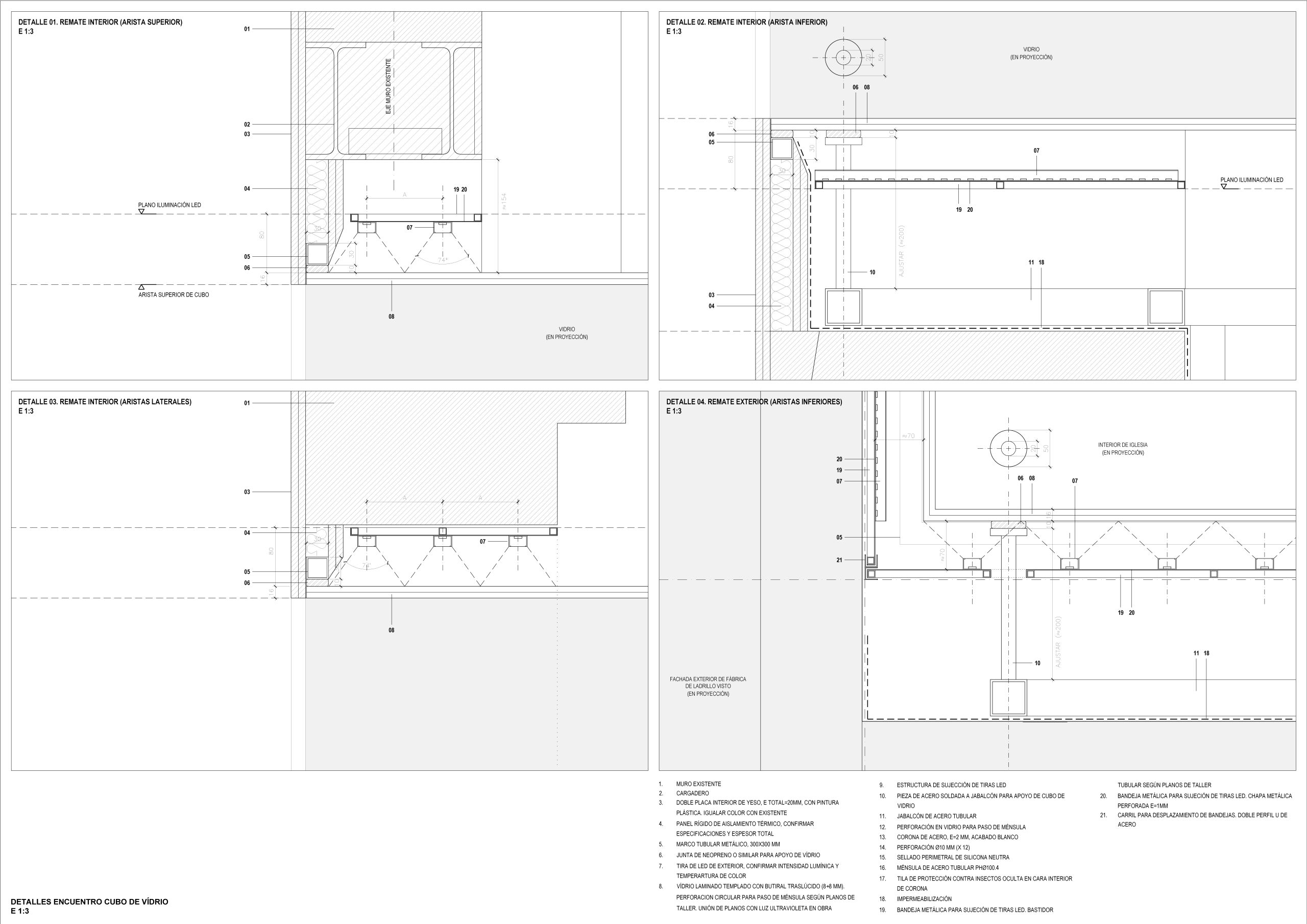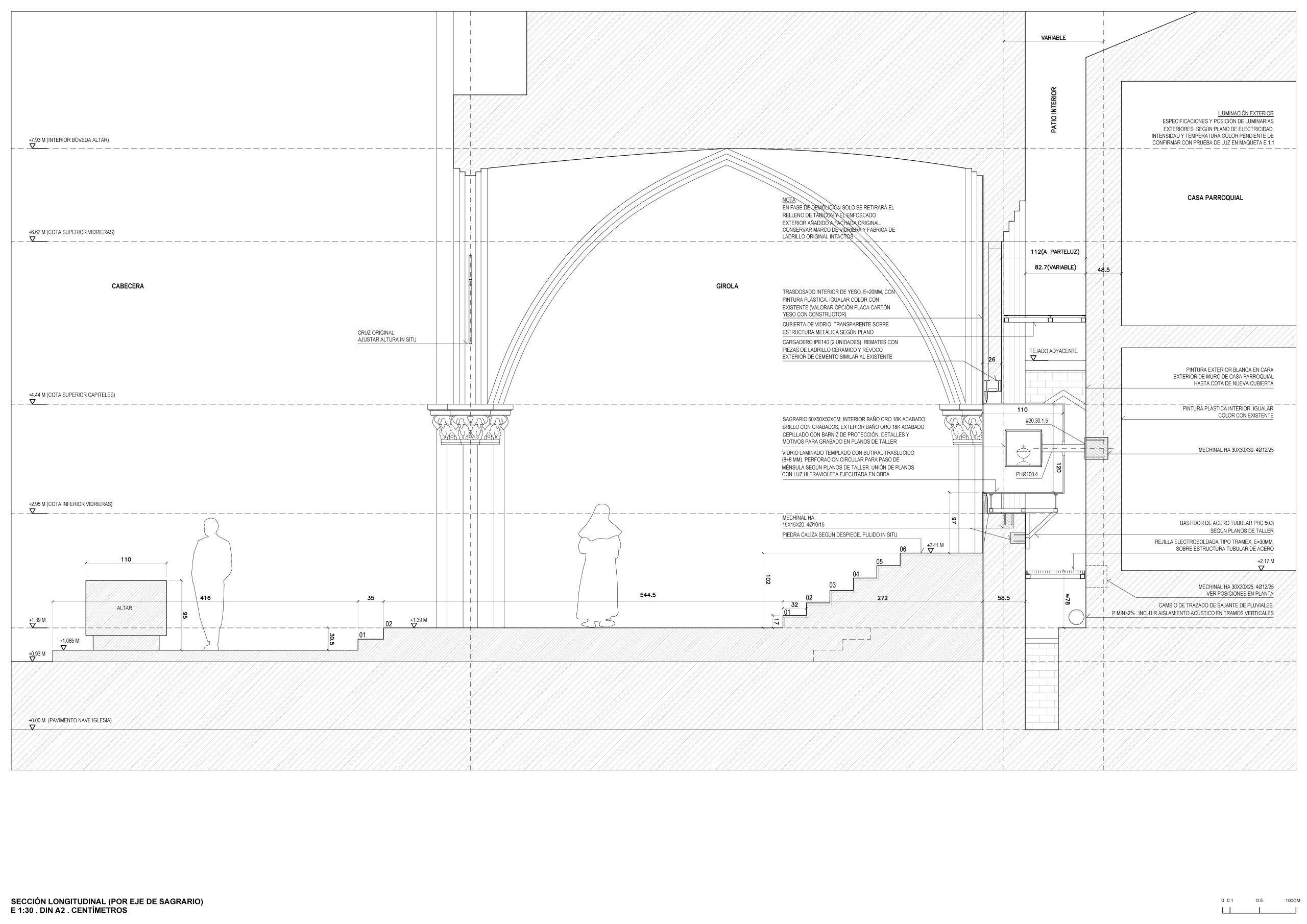 Abrimos un hueco cuadrado en el centro, en alto, en el muro de ladrillo del ábside. De esta manera se consigue la mayor cantidad de luz natural posible. Para recoger esa luz natural, construimos un cubo de vidrio blanco translúcido de 1,20 x 1,20 x 1,20 m, gran parte del cual queda al exterior, recibiendo la luz natural. Para potenciarla, cuando fuere necesario, usamos la tecnología de los leds que, tras numerosas pruebas con maquetas, nos han llevado a unos resultados verdaderamente maravillosos. La nivelación se ha hecho con rayos laser, y la unión de los vidrios traslúcidos que conforman el cubo, con rayos ultravioletas.