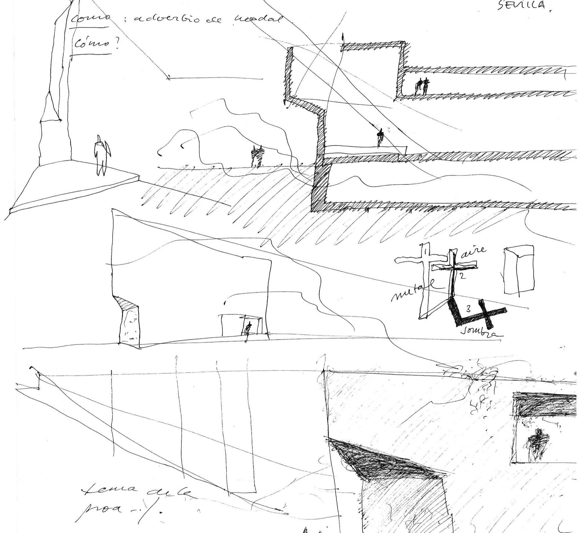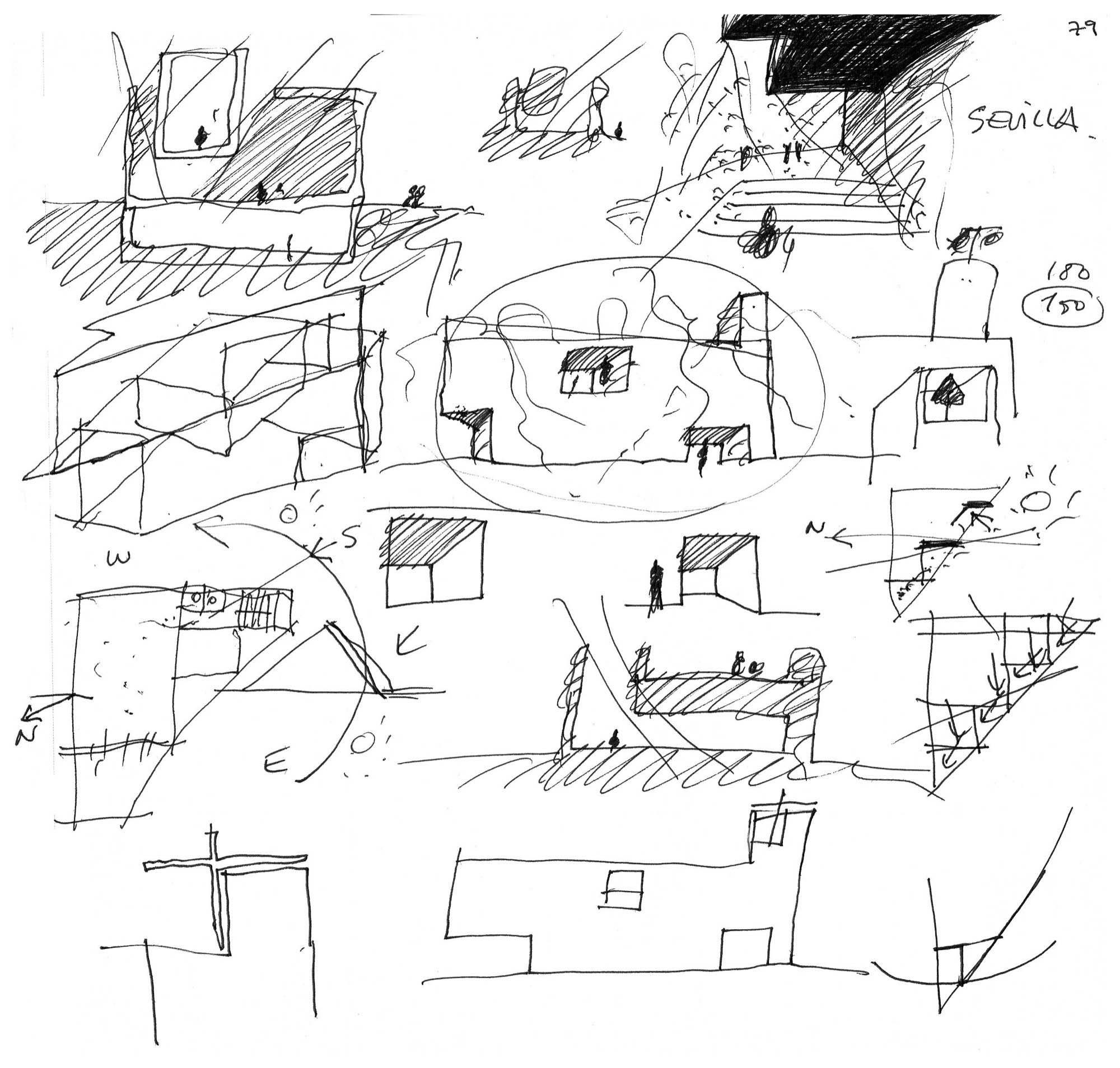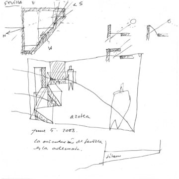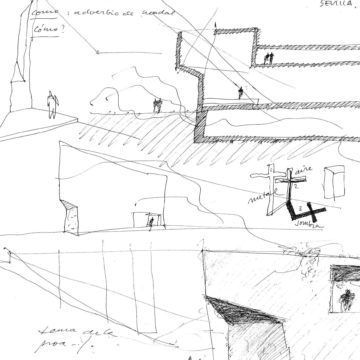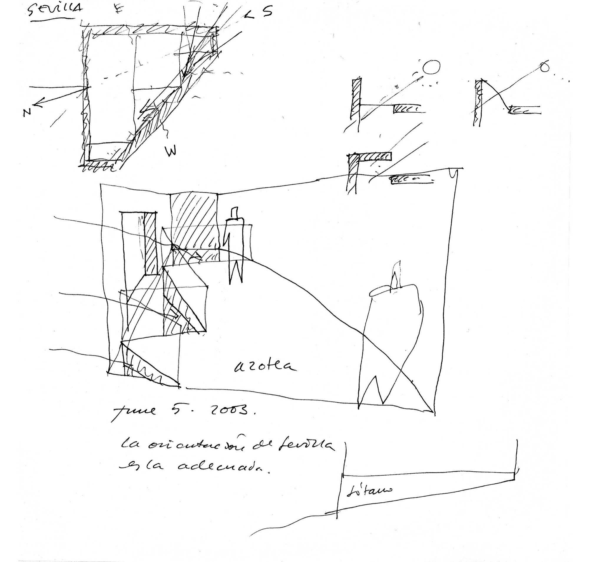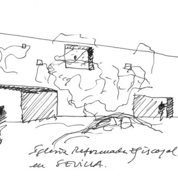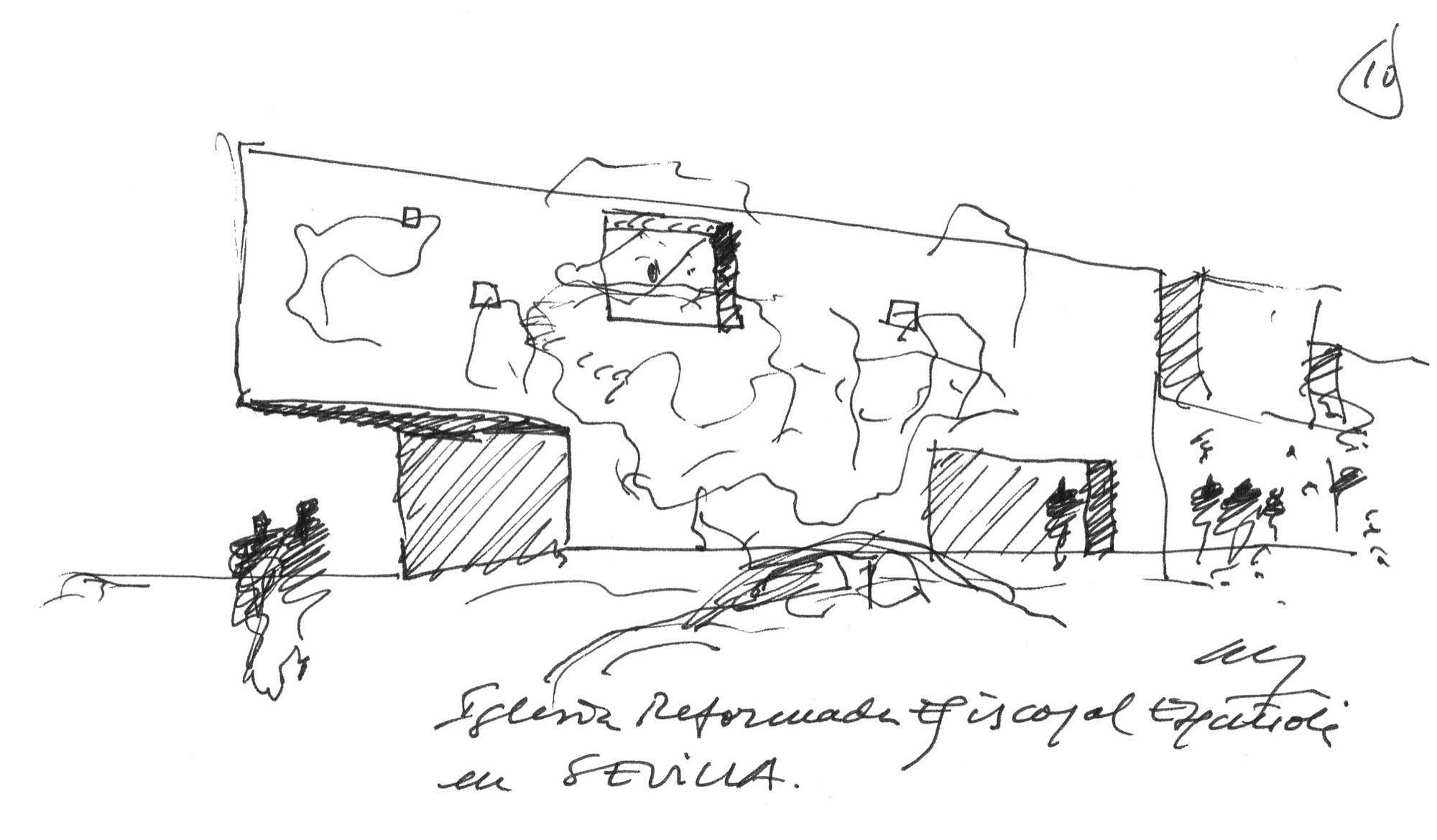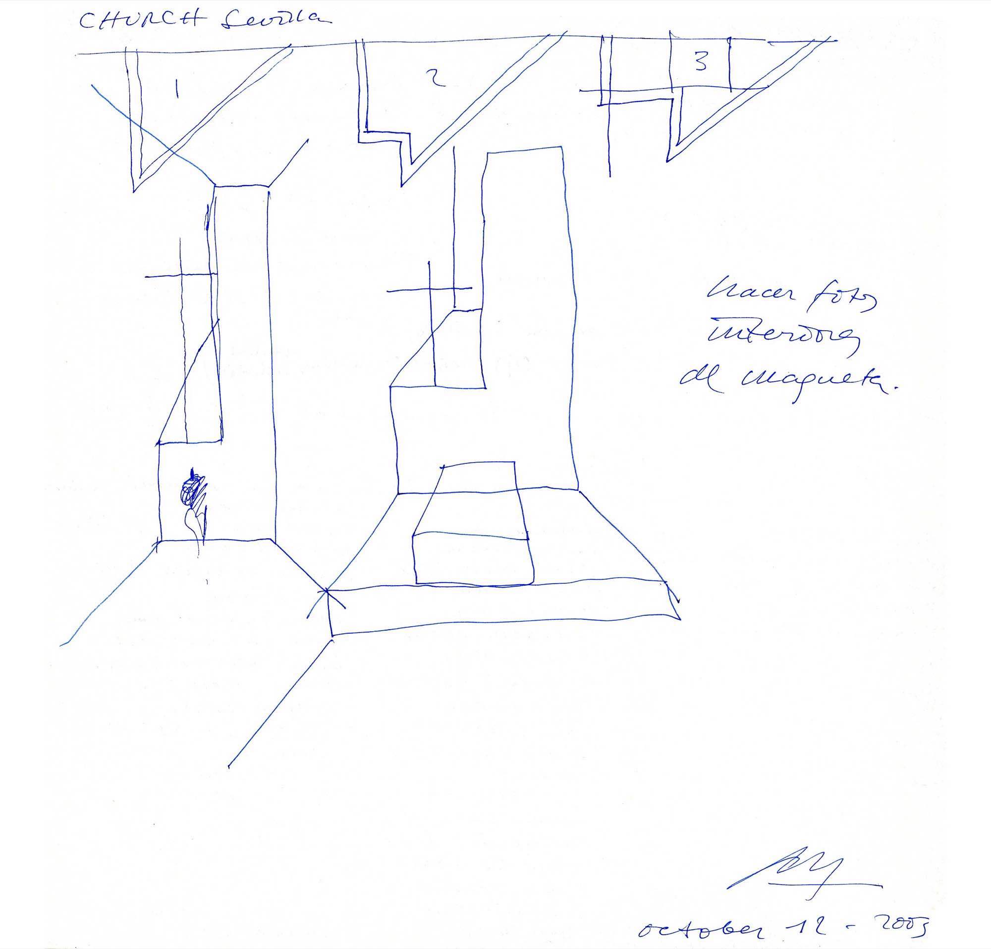 Hacer una iglesia en el barrio de la Macarena de Sevilla, una ciudad llena de luz. El solar es un pequeño triángulo con una sola medianera en el que levantamos el sólido capaz. La planta triangular hace que aparezca una proa que emergiendo del volumen sencillo y blanco, expresa de alguna manera el carácter singular del edificio.