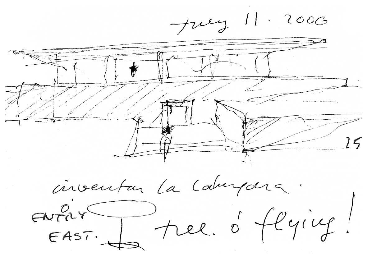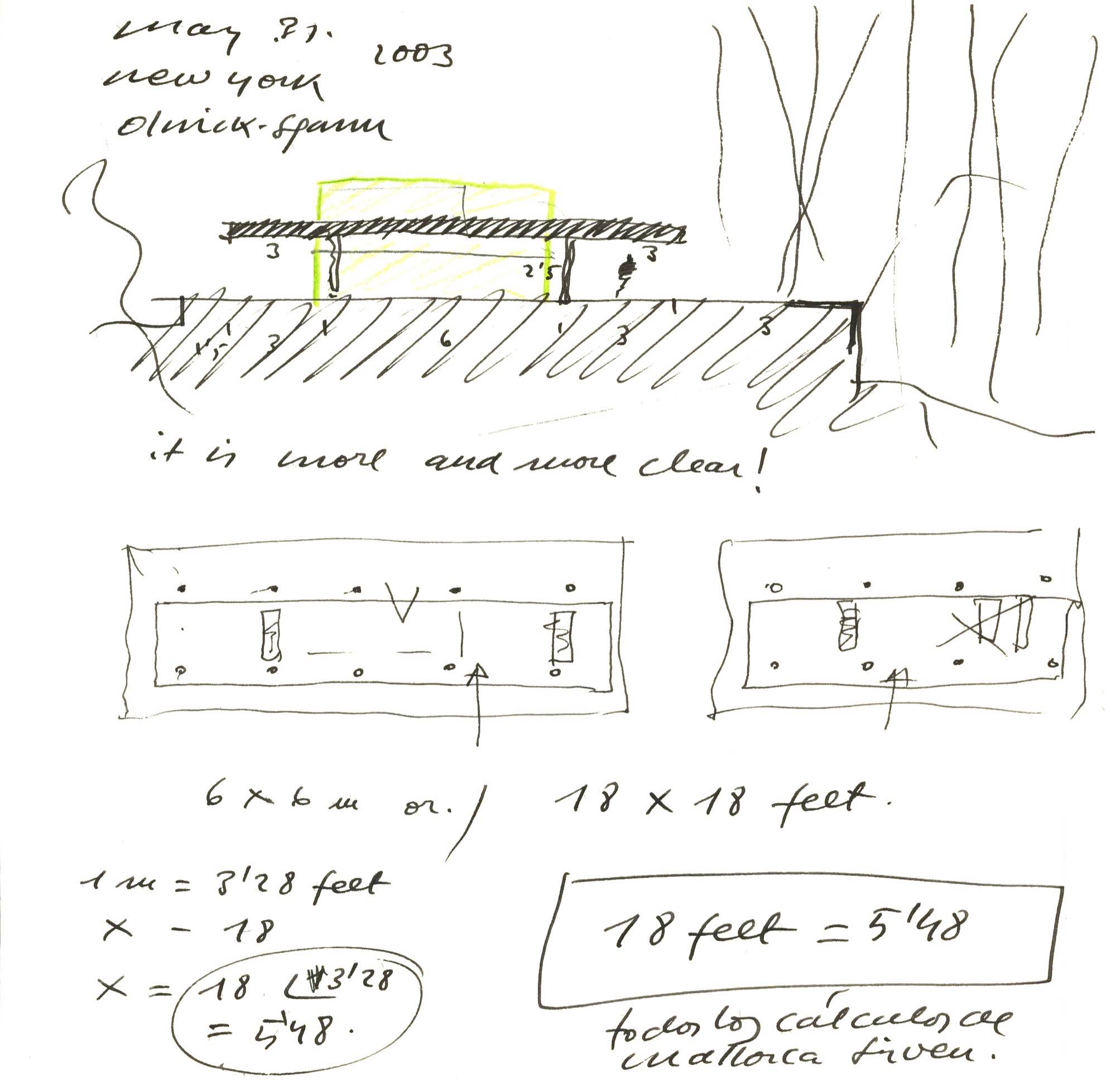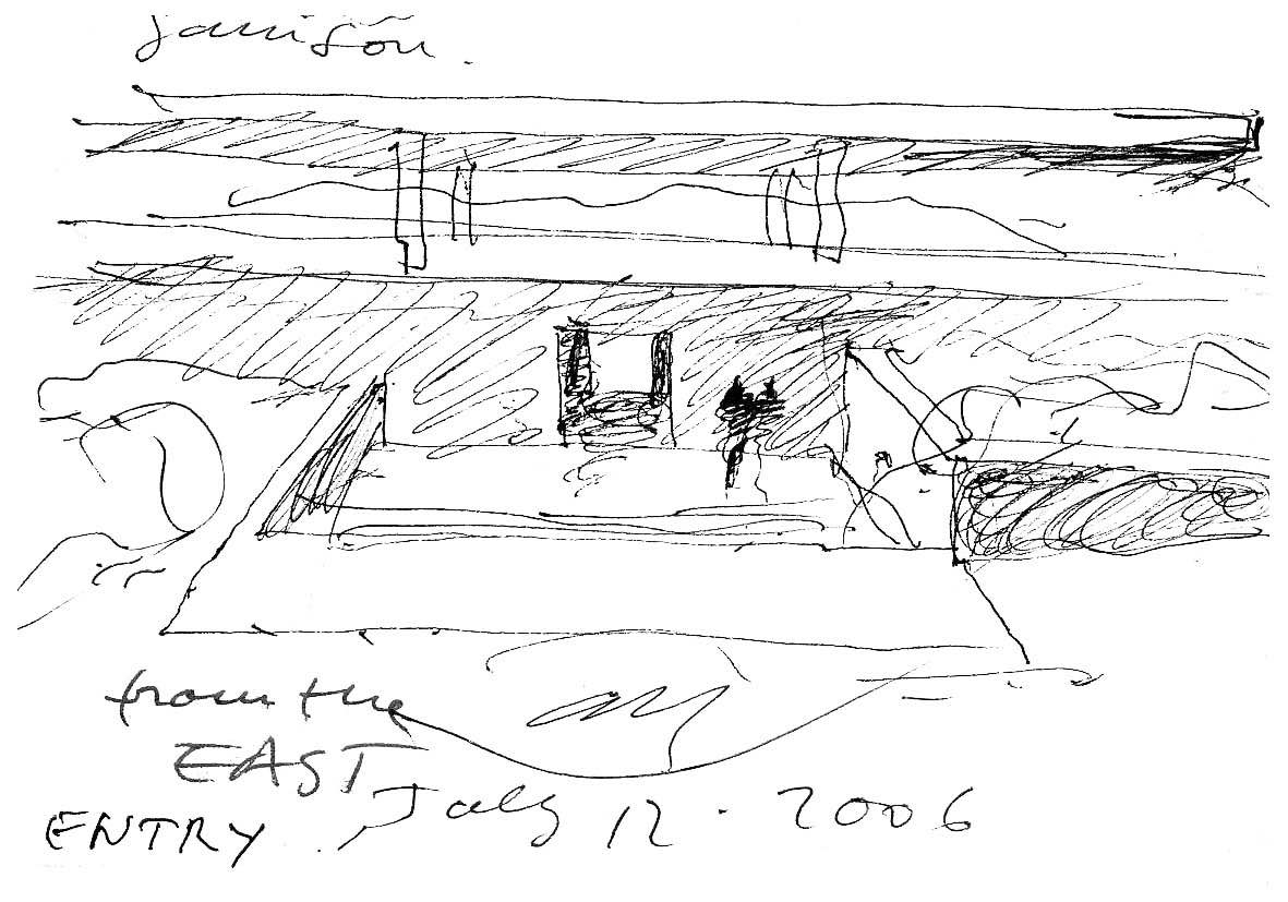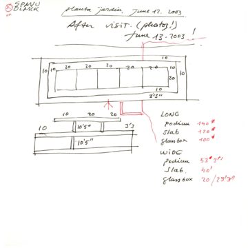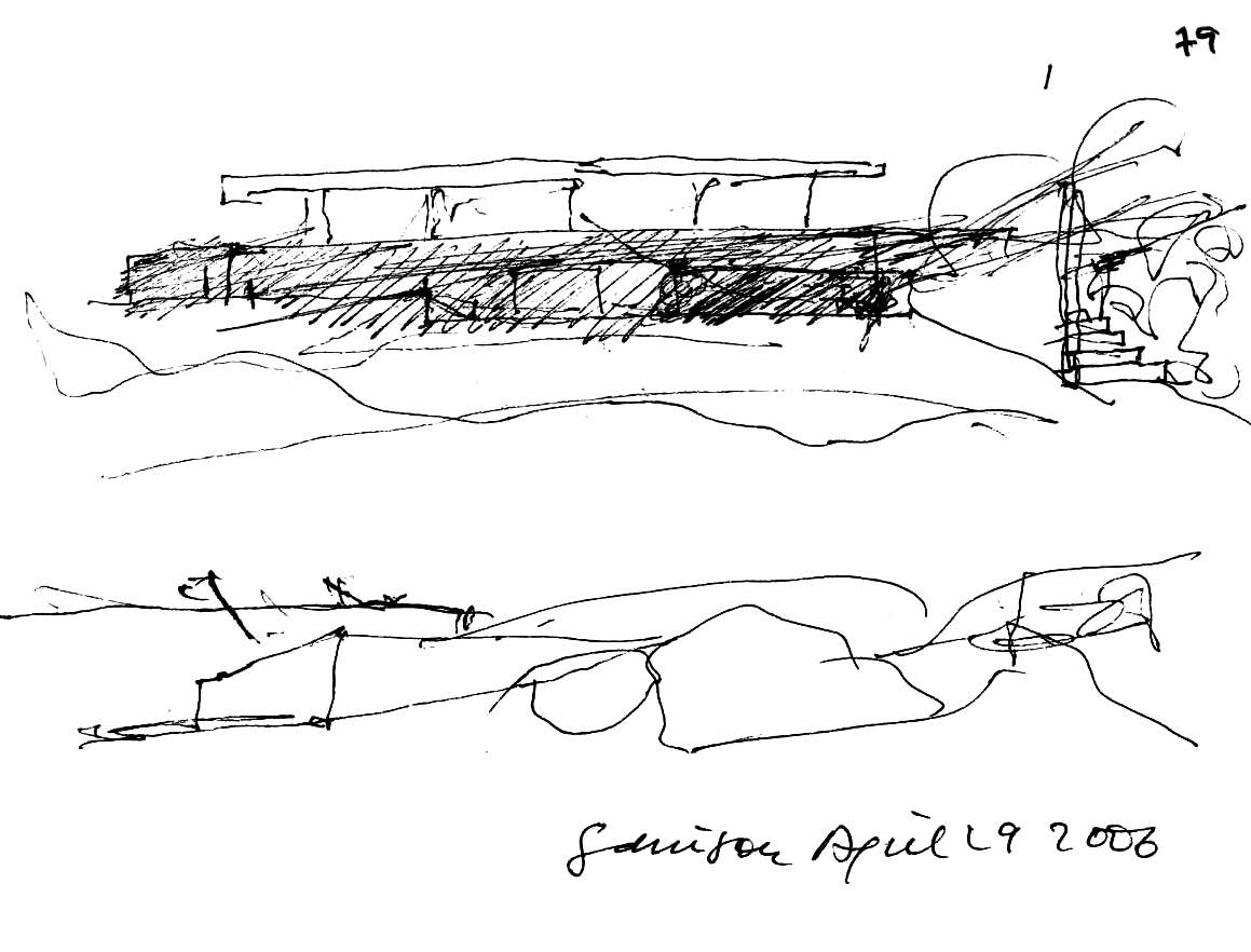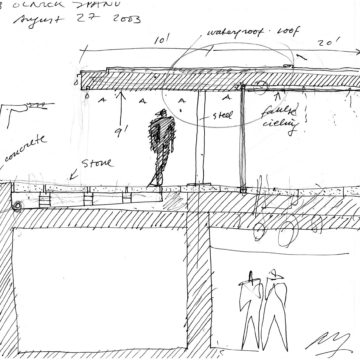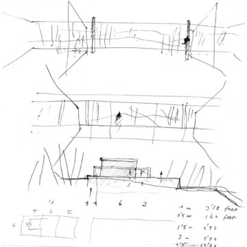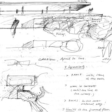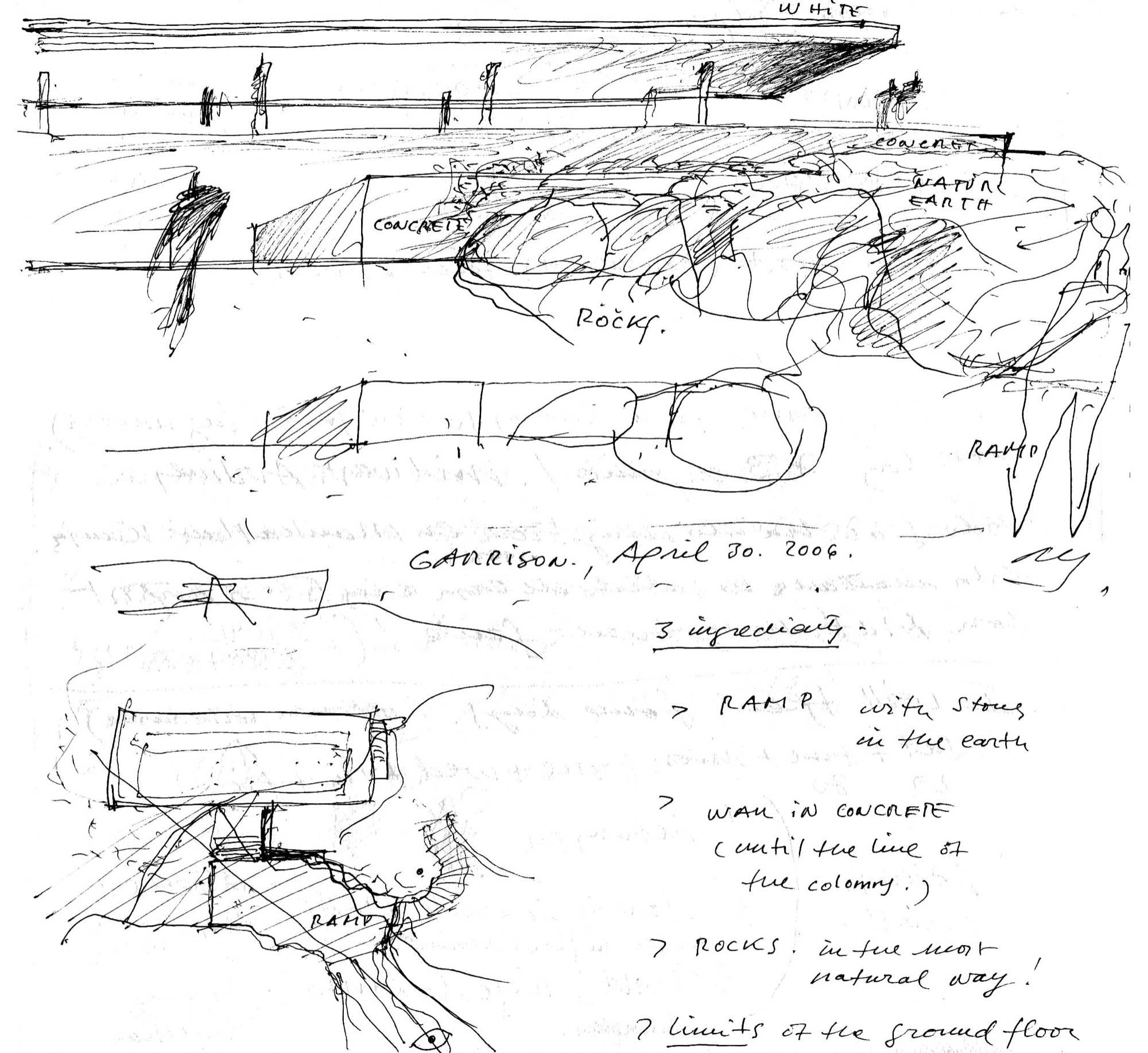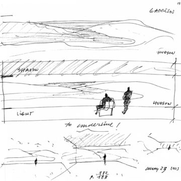 En un lugar de profunda calma donde tras un día de lluvia y niebla, una intensa luz se refleja en la quietud del espejo de las profundas aguas del majestuoso río Hudson. En este impresionante lugar, decidimos establecer un plano, una plataforma, que subrayando el paisaje que aparece frente a nosotros, intentara realzar el paisaje. Construimos una gran caja de 122 pies de largo por 54 pies de ancho por 12 pies de alto. Con recias paredes de hormigón que acentúan su relación con la tierra. La cubierta de esta caja es plana y de piedra, travertino, para establecernos sobre ella.