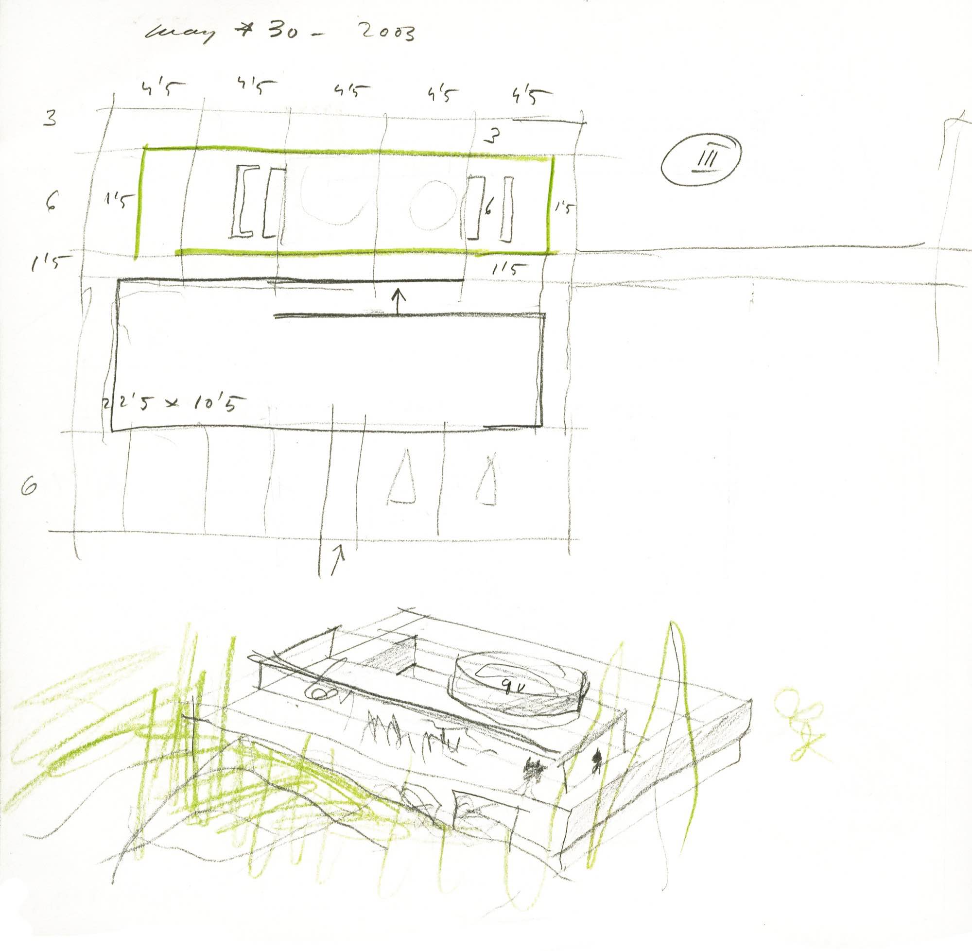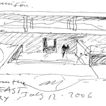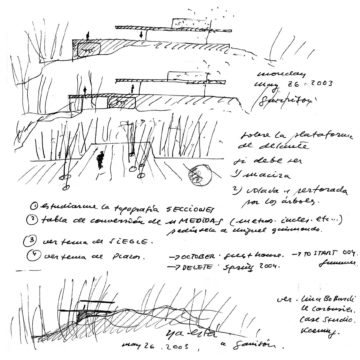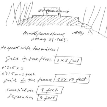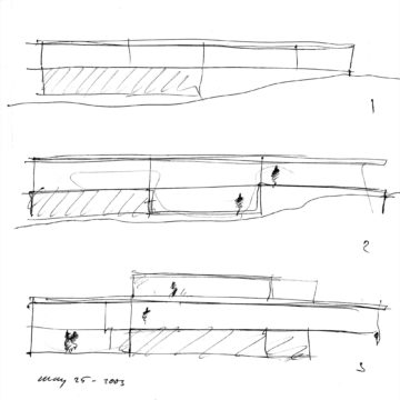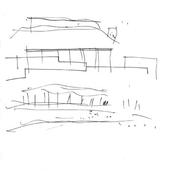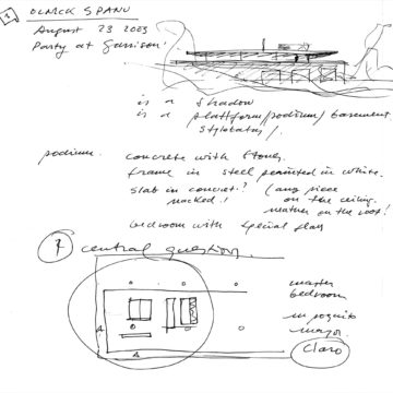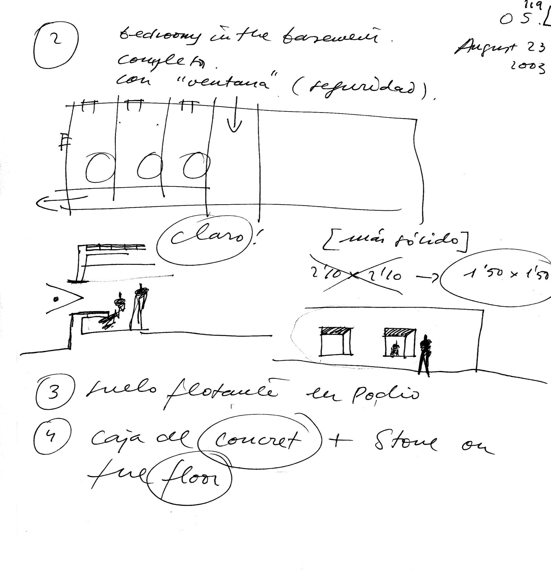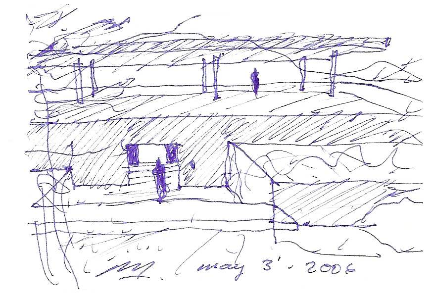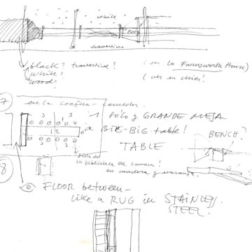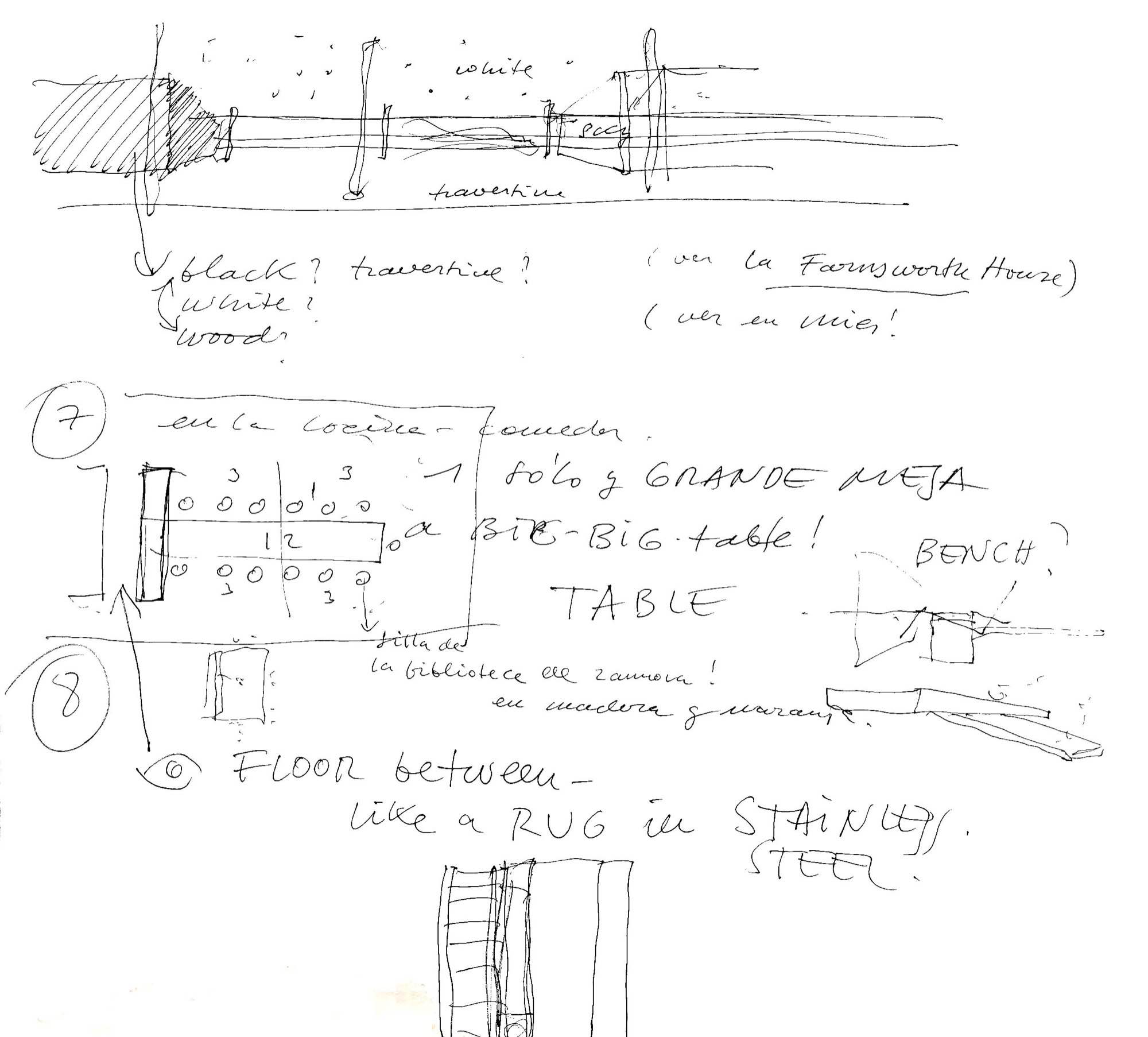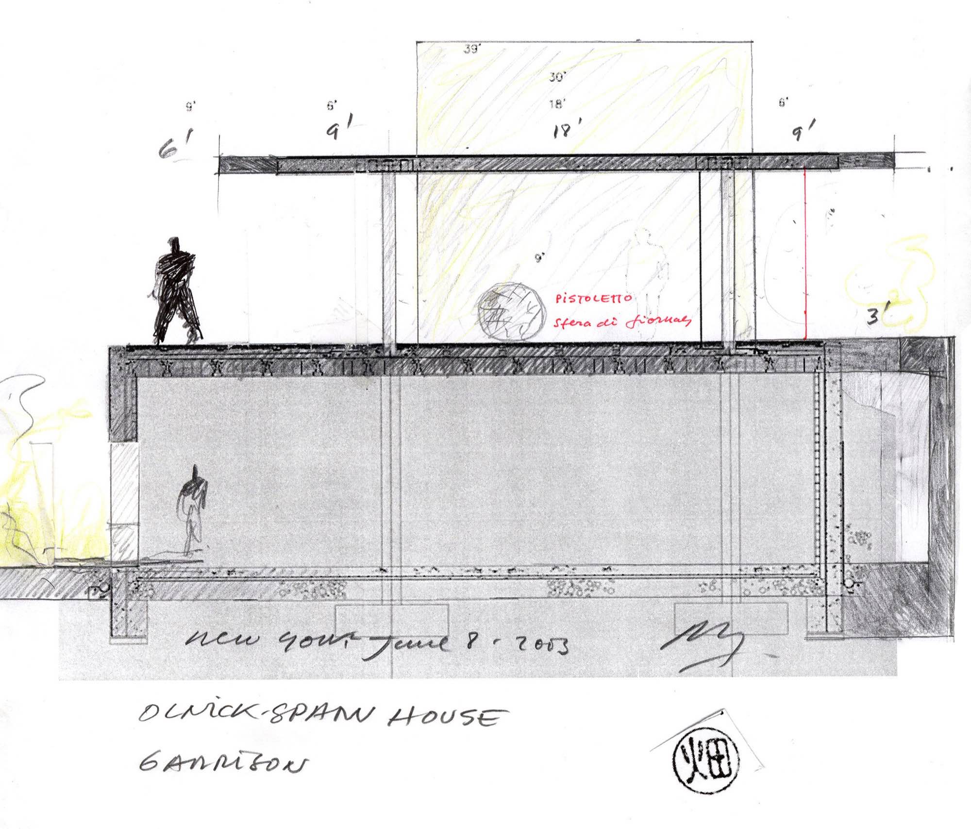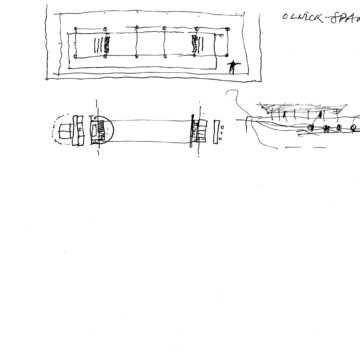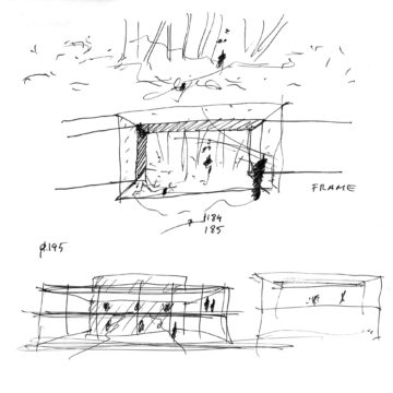 En un lugar de profunda calma donde tras un día de lluvia y niebla, una intensa luz se refleja en la quietud del espejo de las profundas aguas del majestuoso río Hudson. En este impresionante lugar, decidimos establecer un plano, una plataforma, que subrayando el paisaje que aparece frente a nosotros, intentara realzar el paisaje. Construimos una gran caja de 122 pies de largo por 54 pies de ancho por 12 pies de alto. Con recias paredes de hormigón que acentúan su relación con la tierra. La cubierta de esta caja es plana y de piedra, travertino, para establecernos sobre ella.