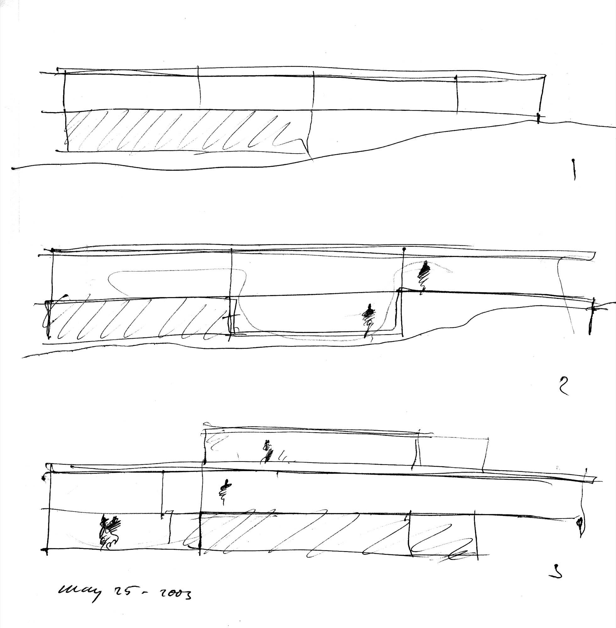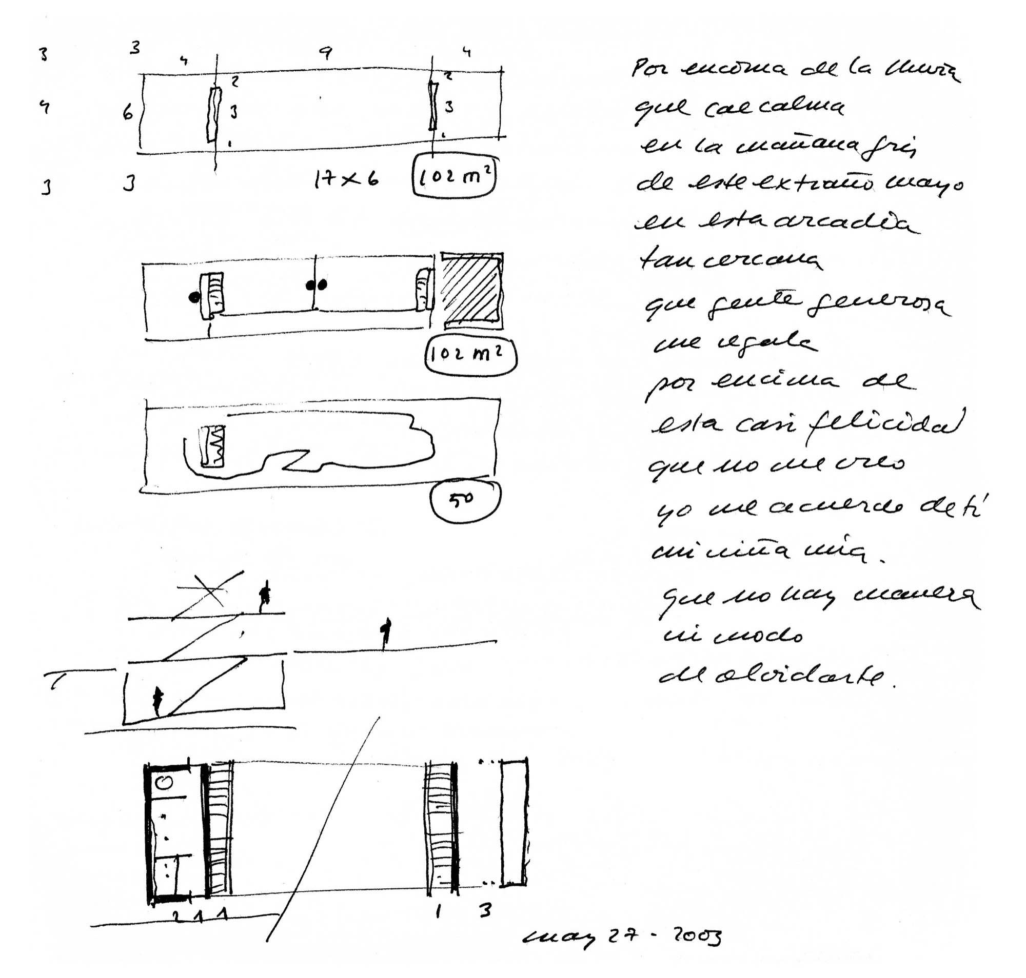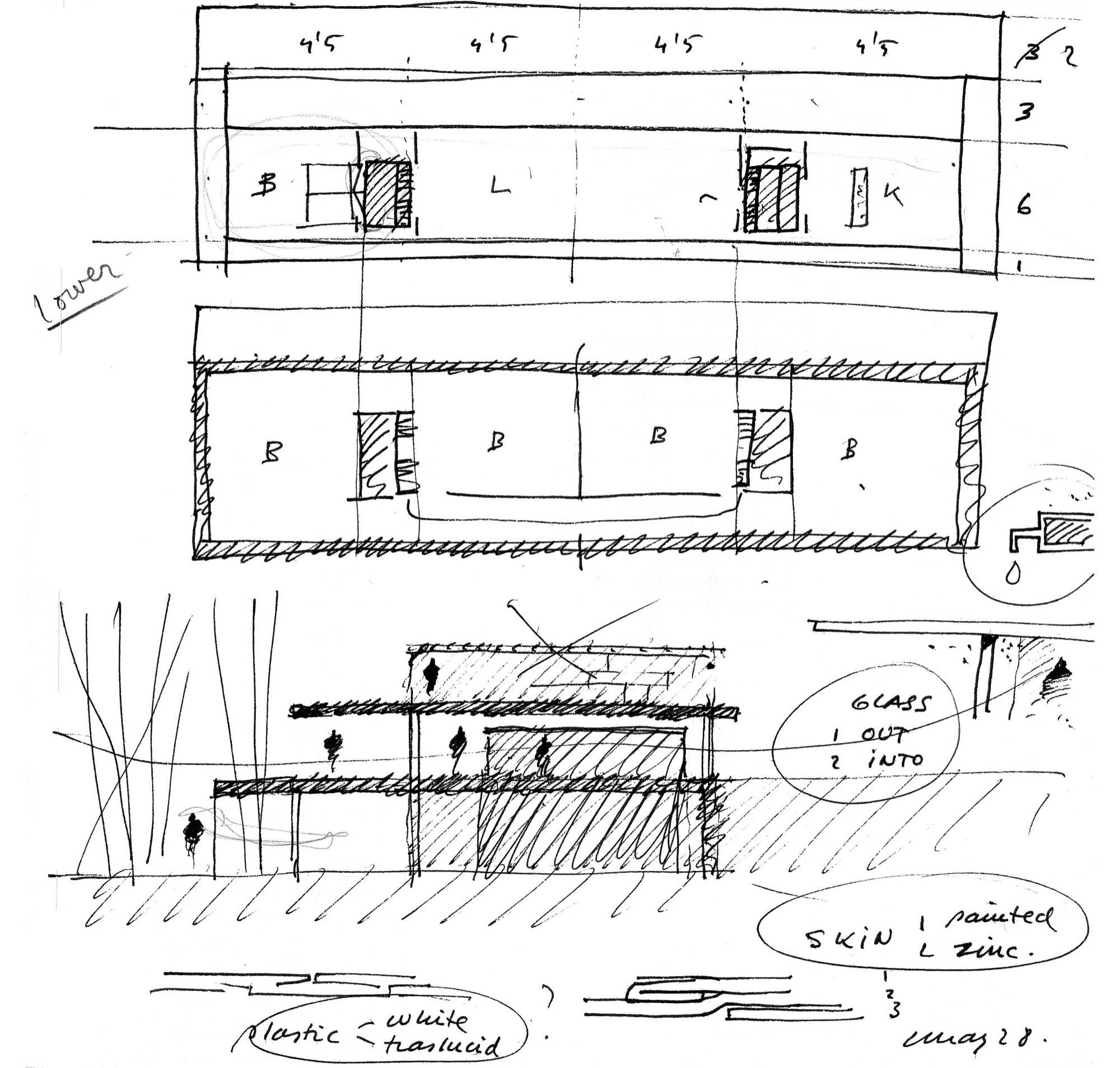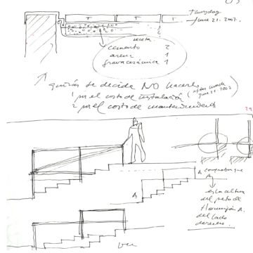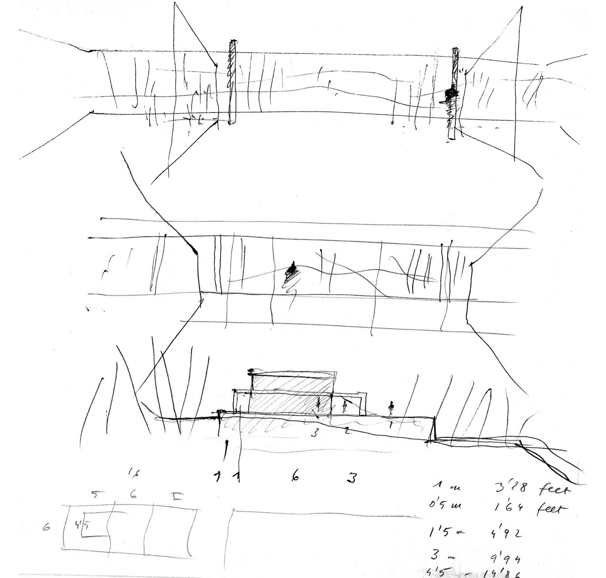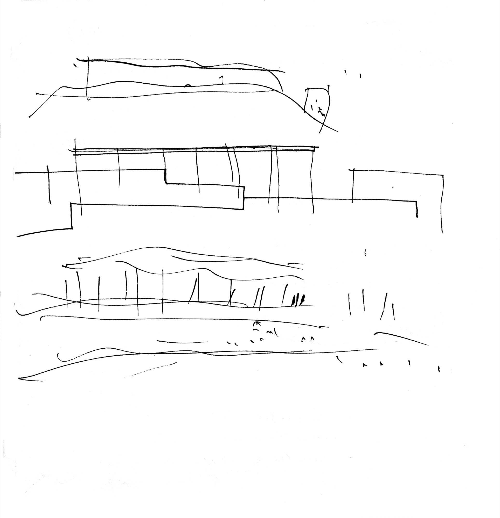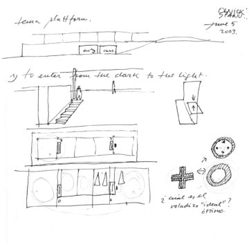 En un lugar de profunda calma donde tras un día de lluvia y niebla, una intensa luz se refleja en la quietud del espejo de las profundas aguas del majestuoso río Hudson. En este impresionante lugar, decidimos establecer un plano, una plataforma, que subrayando el paisaje que aparece frente a nosotros, intentara realzar el paisaje. Construimos una gran caja de 122 pies de largo por 54 pies de ancho por 12 pies de alto. Con recias paredes de hormigón que acentúan su relación con la tierra. La cubierta de esta caja es plana y de piedra, travertino, para establecernos sobre ella.