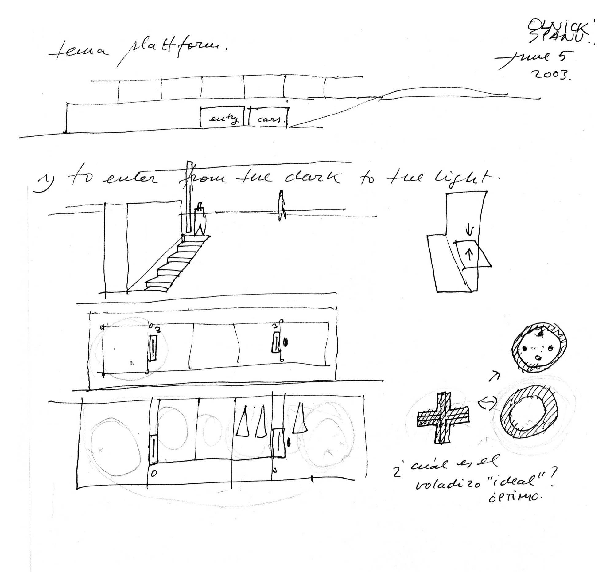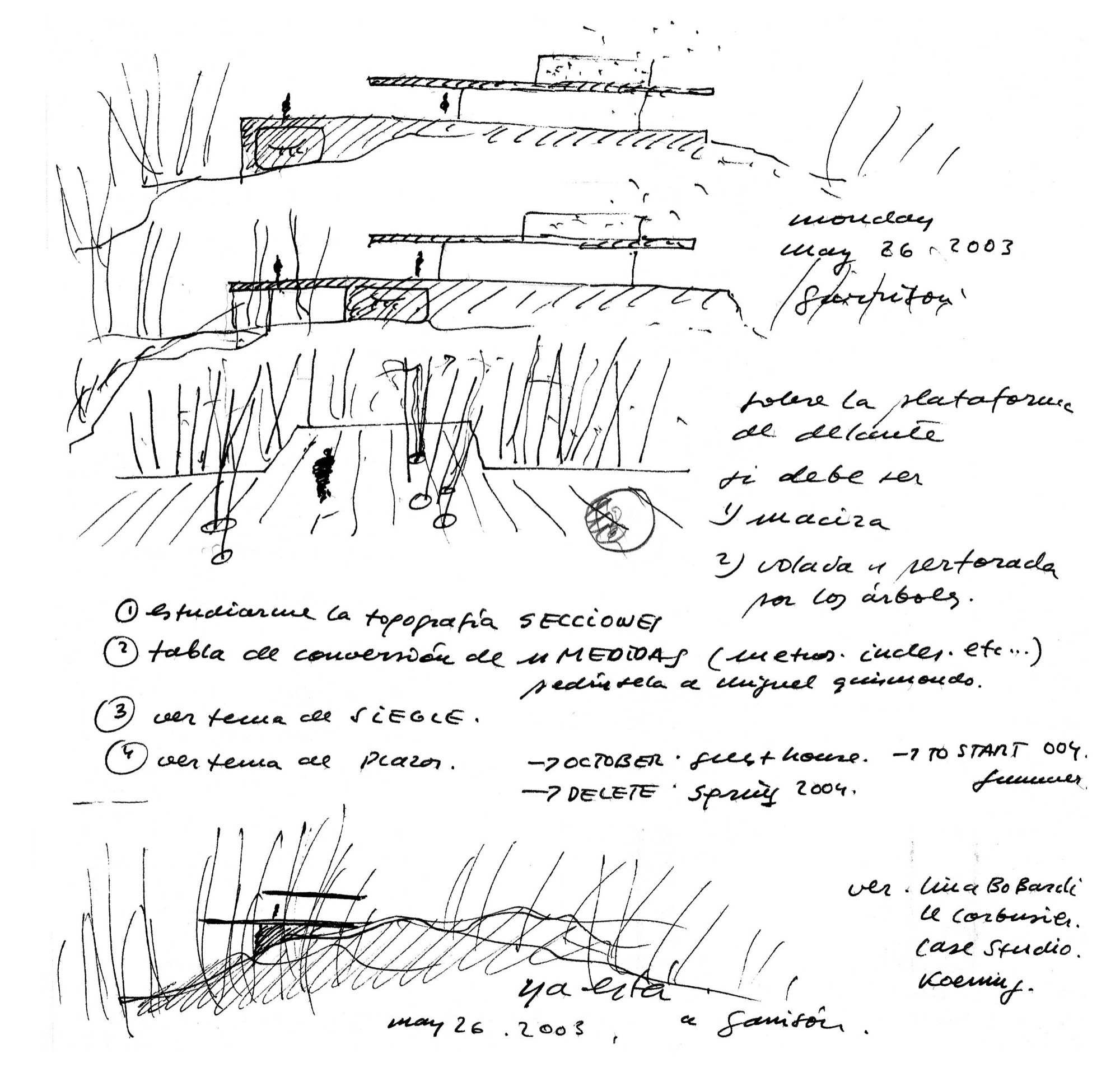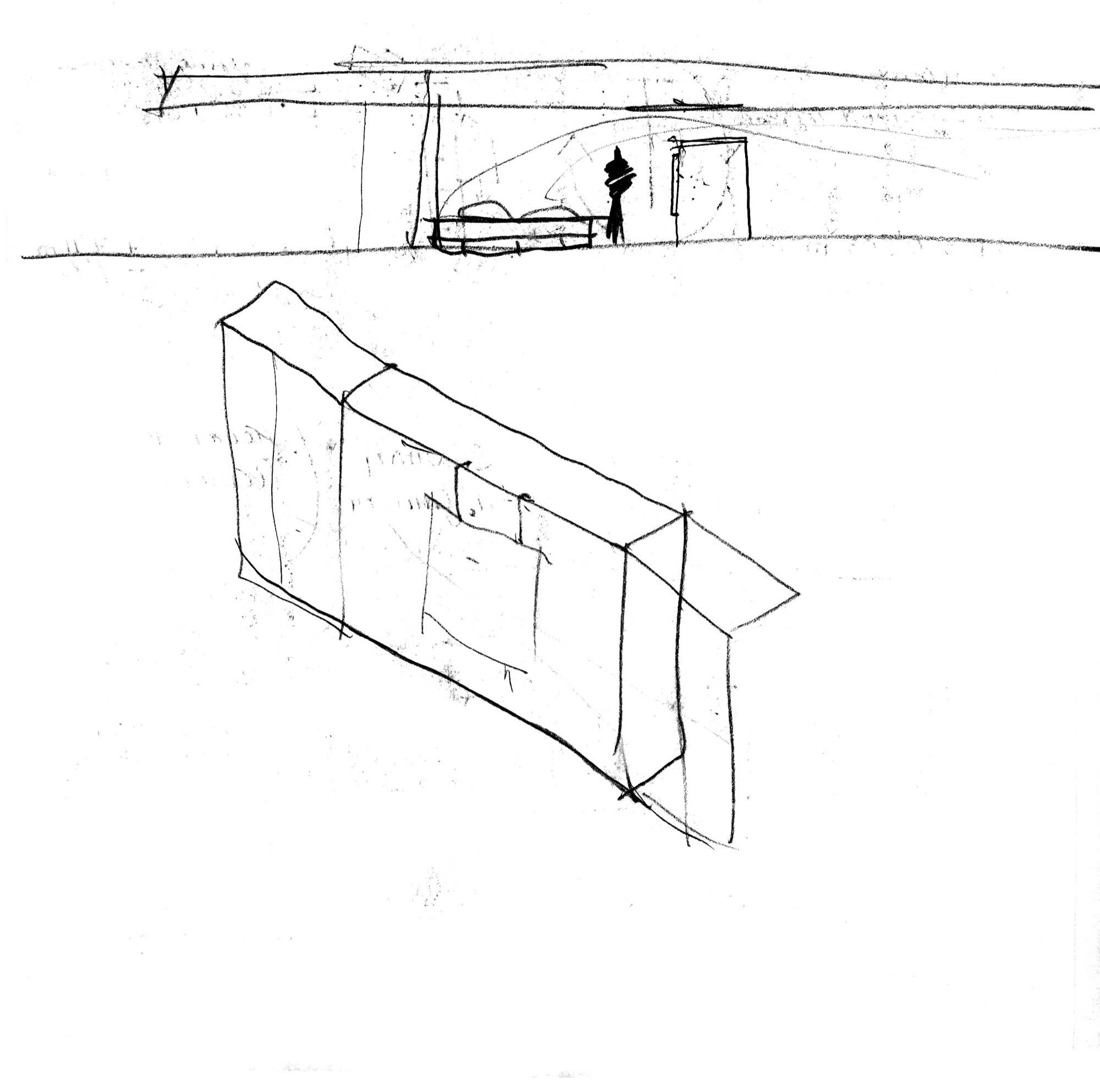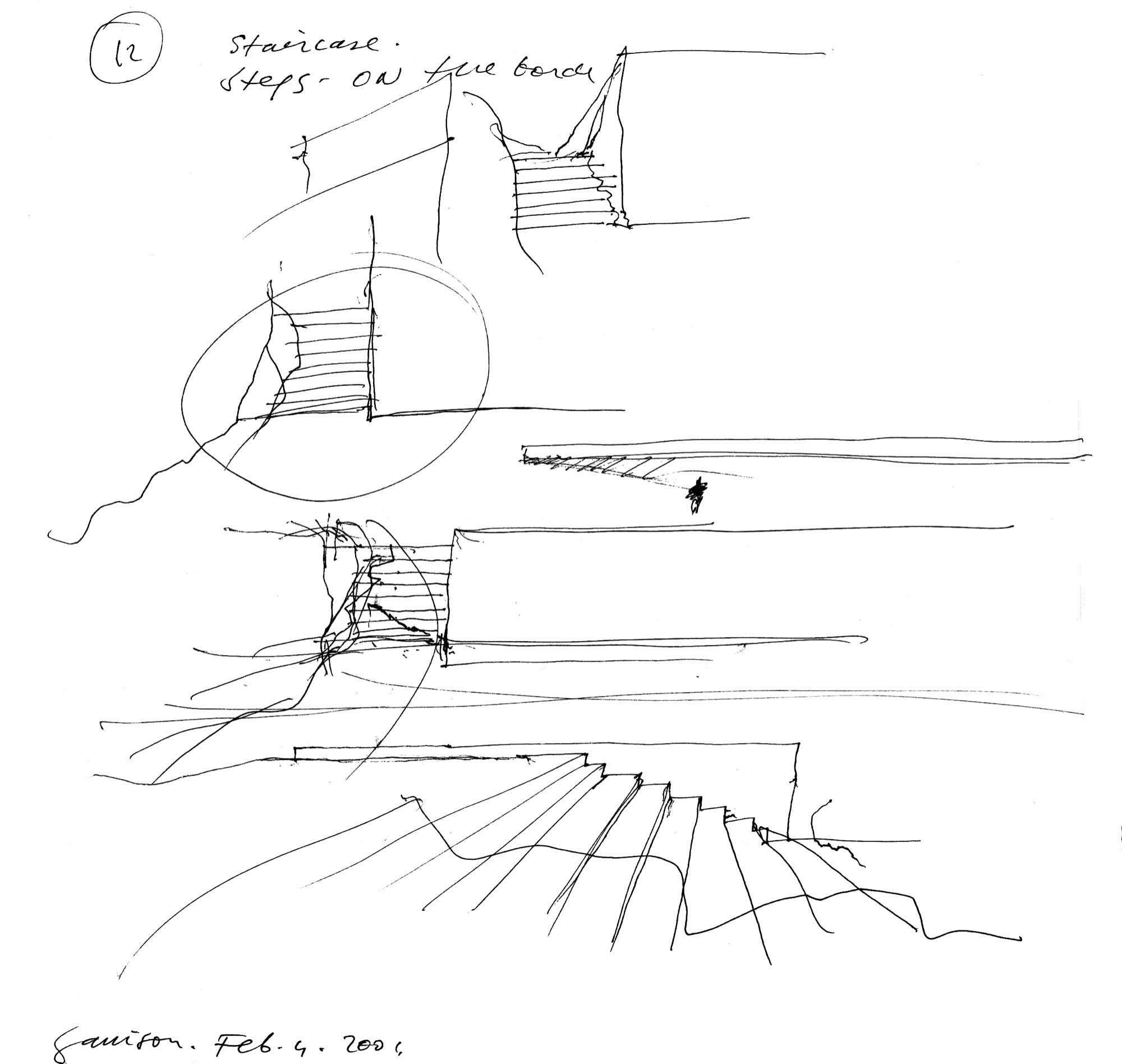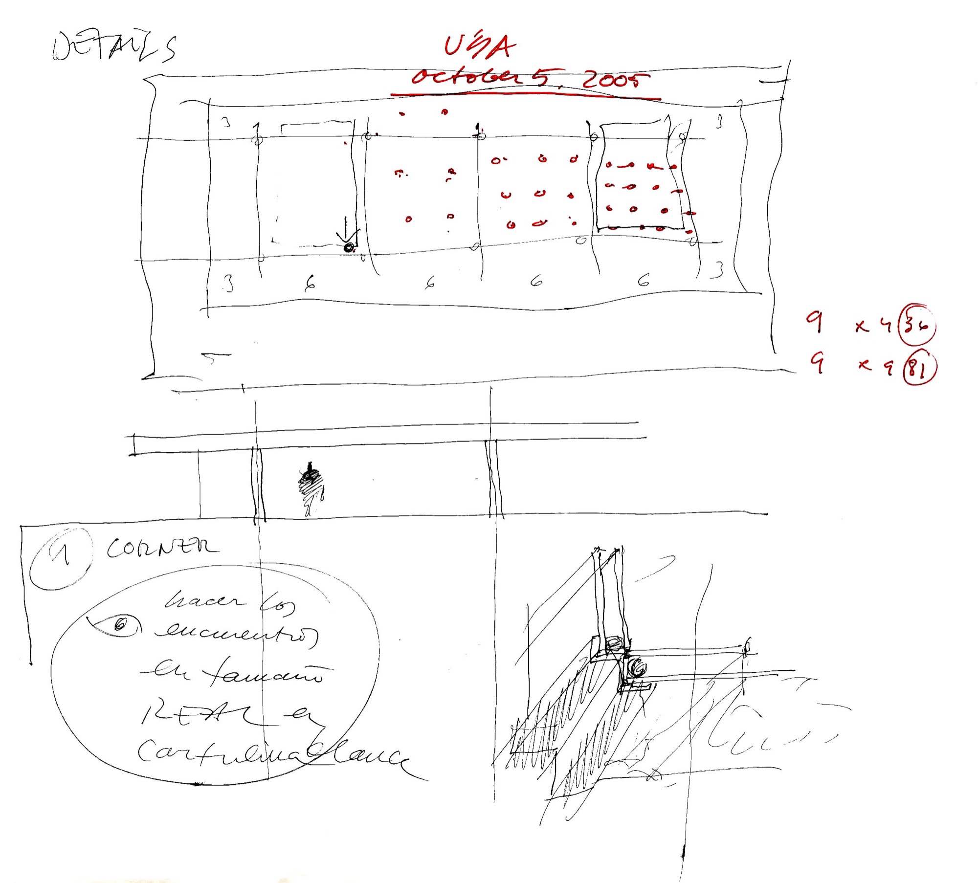 En un lugar de profunda calma donde tras un día de lluvia y niebla, una intensa luz se refleja en la quietud del espejo de las profundas aguas del majestuoso río Hudson. En este impresionante lugar, decidimos establecer un plano, una plataforma, que subrayando el paisaje que aparece frente a nosotros, intentara realzar el paisaje. Construimos una gran caja de 122 pies de largo por 54 pies de ancho por 12 pies de alto. Con recias paredes de hormigón que acentúan su relación con la tierra. La cubierta de esta caja es plana y de piedra, travertino, para establecernos sobre ella.