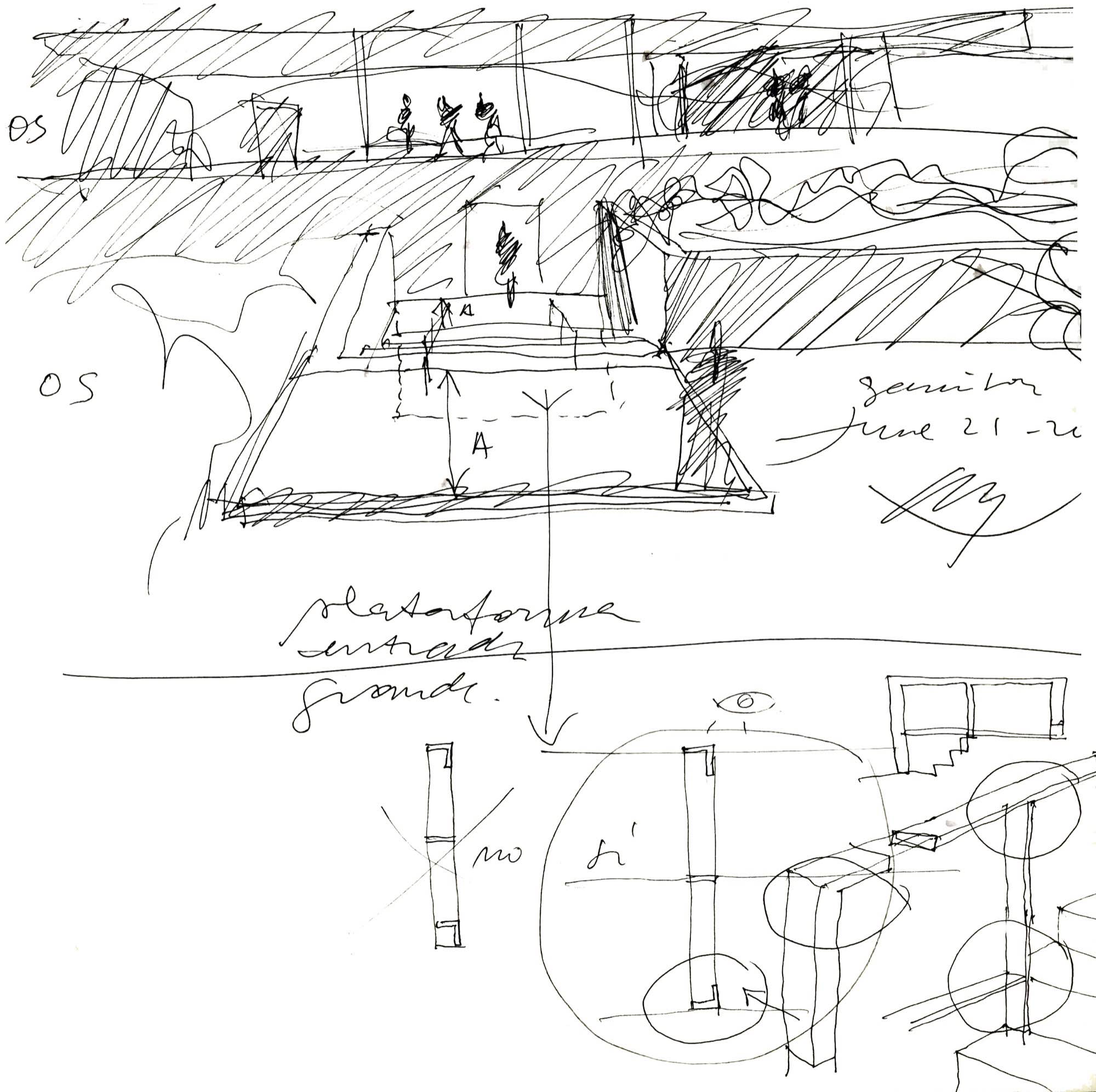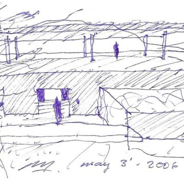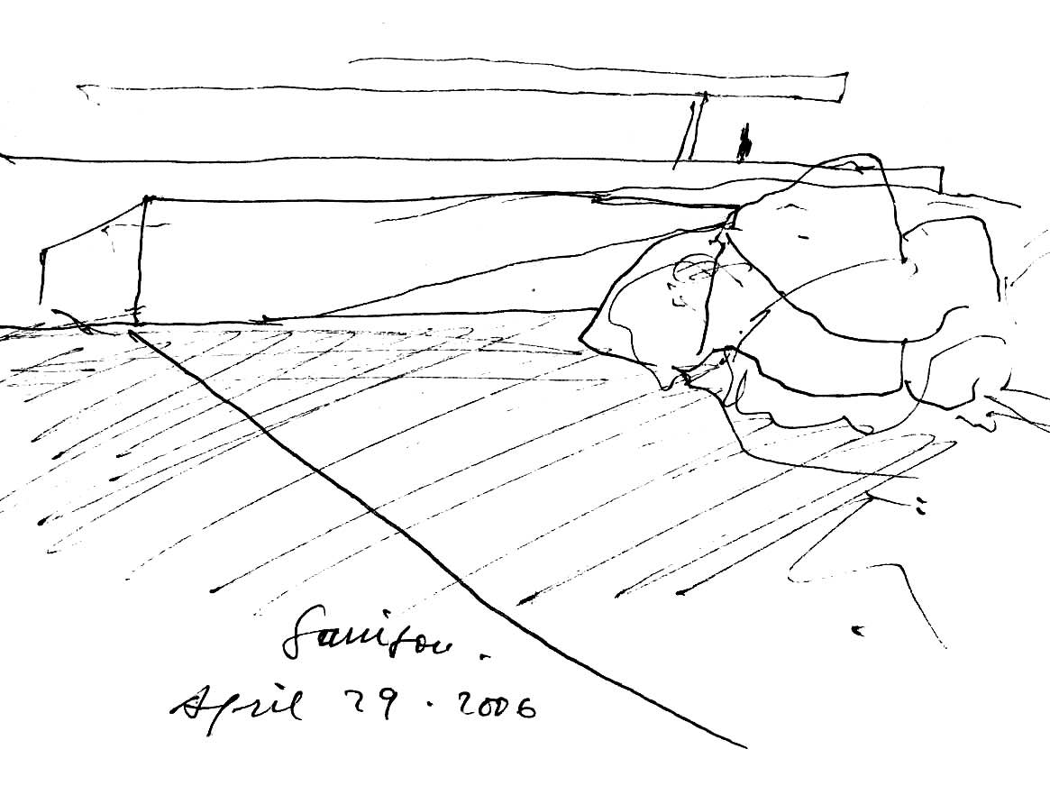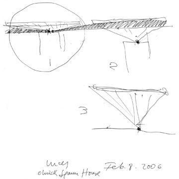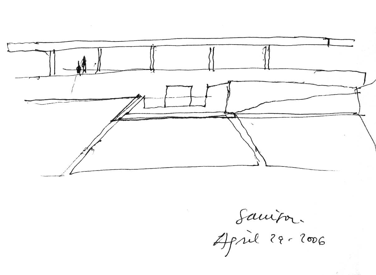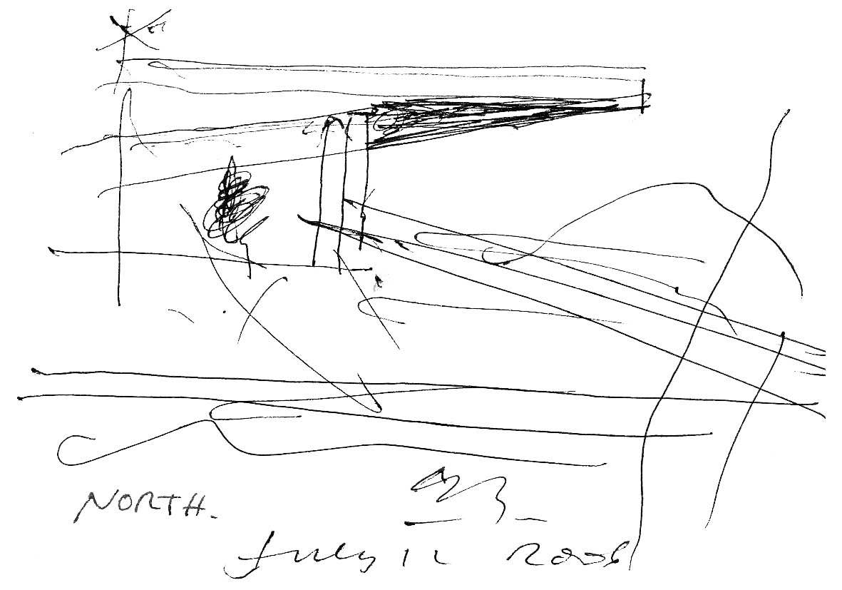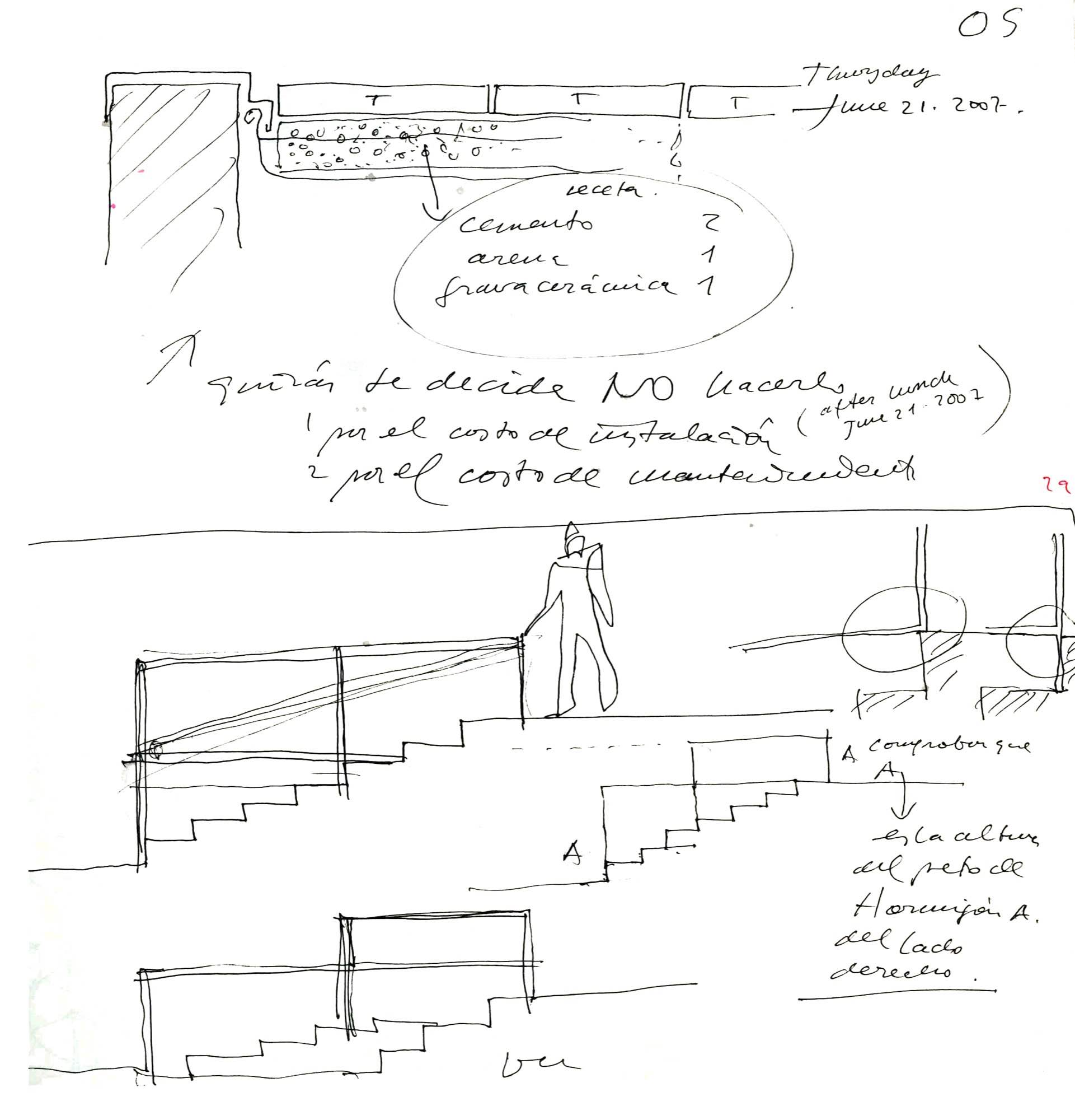 En un lugar de profunda calma donde tras un día de lluvia y niebla, una intensa luz se refleja en la quietud del espejo de las profundas aguas del majestuoso río Hudson. En este impresionante lugar, decidimos establecer un plano, una plataforma, que subrayando el paisaje que aparece frente a nosotros, intentara realzar el paisaje. Construimos una gran caja de 122 pies de largo por 54 pies de ancho por 12 pies de alto. Con recias paredes de hormigón que acentúan su relación con la tierra. La cubierta de esta caja es plana y de piedra, travertino, para establecernos sobre ella.