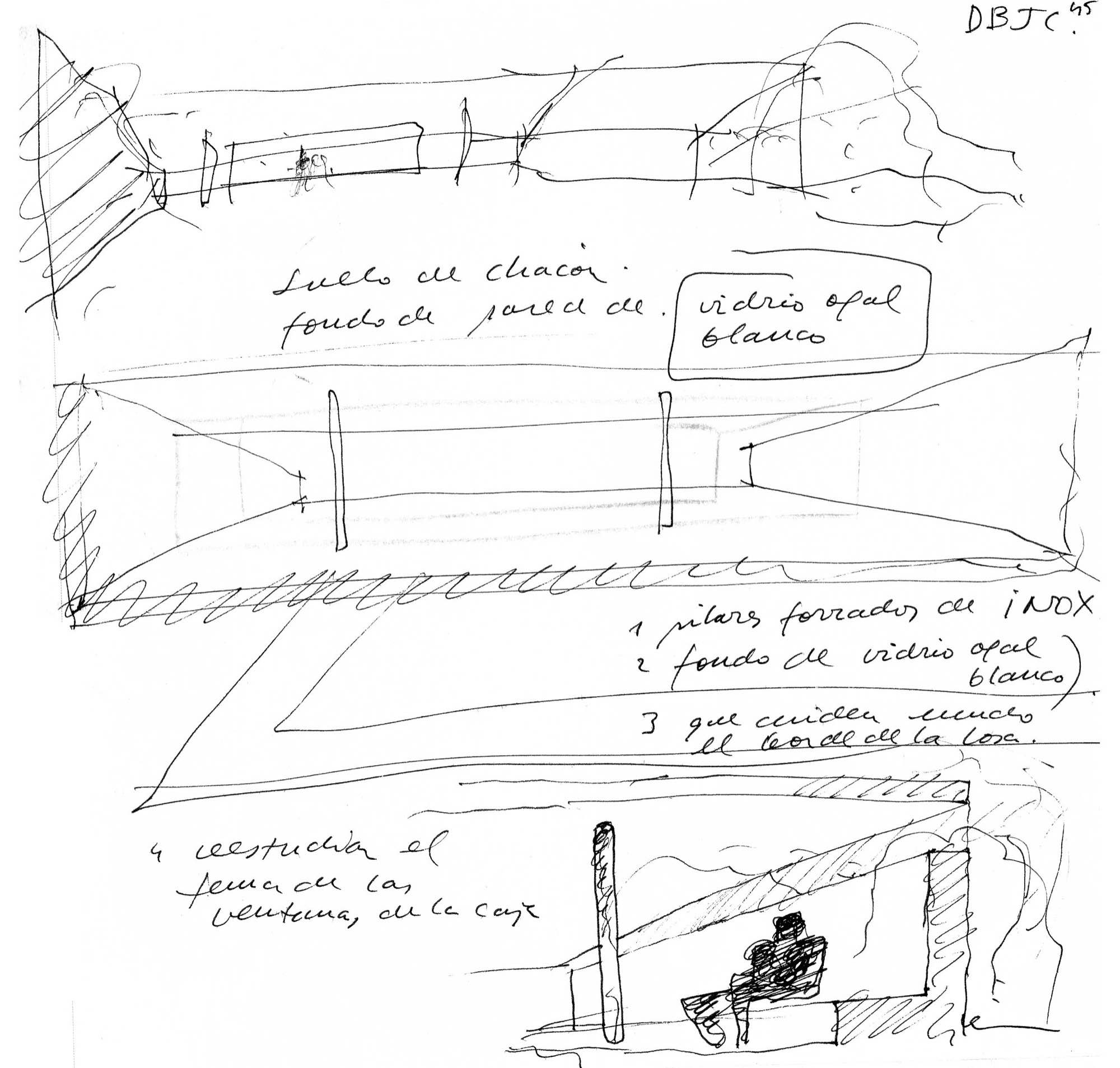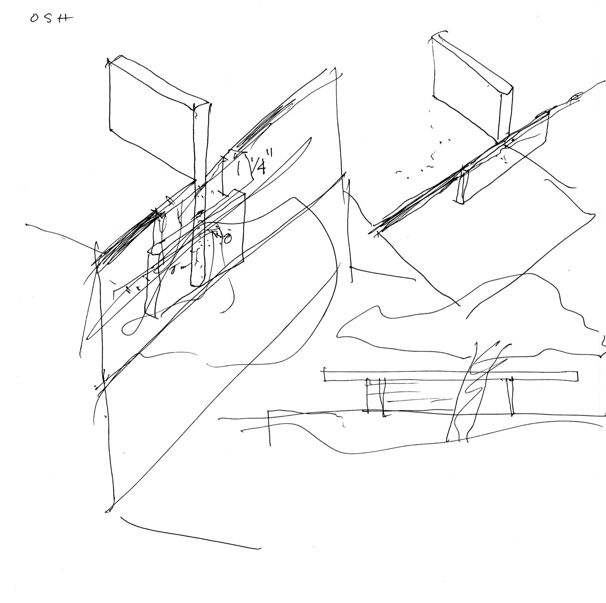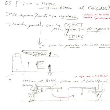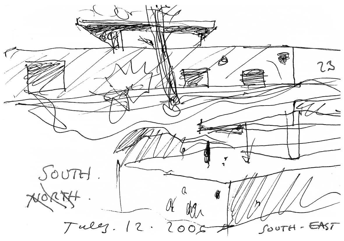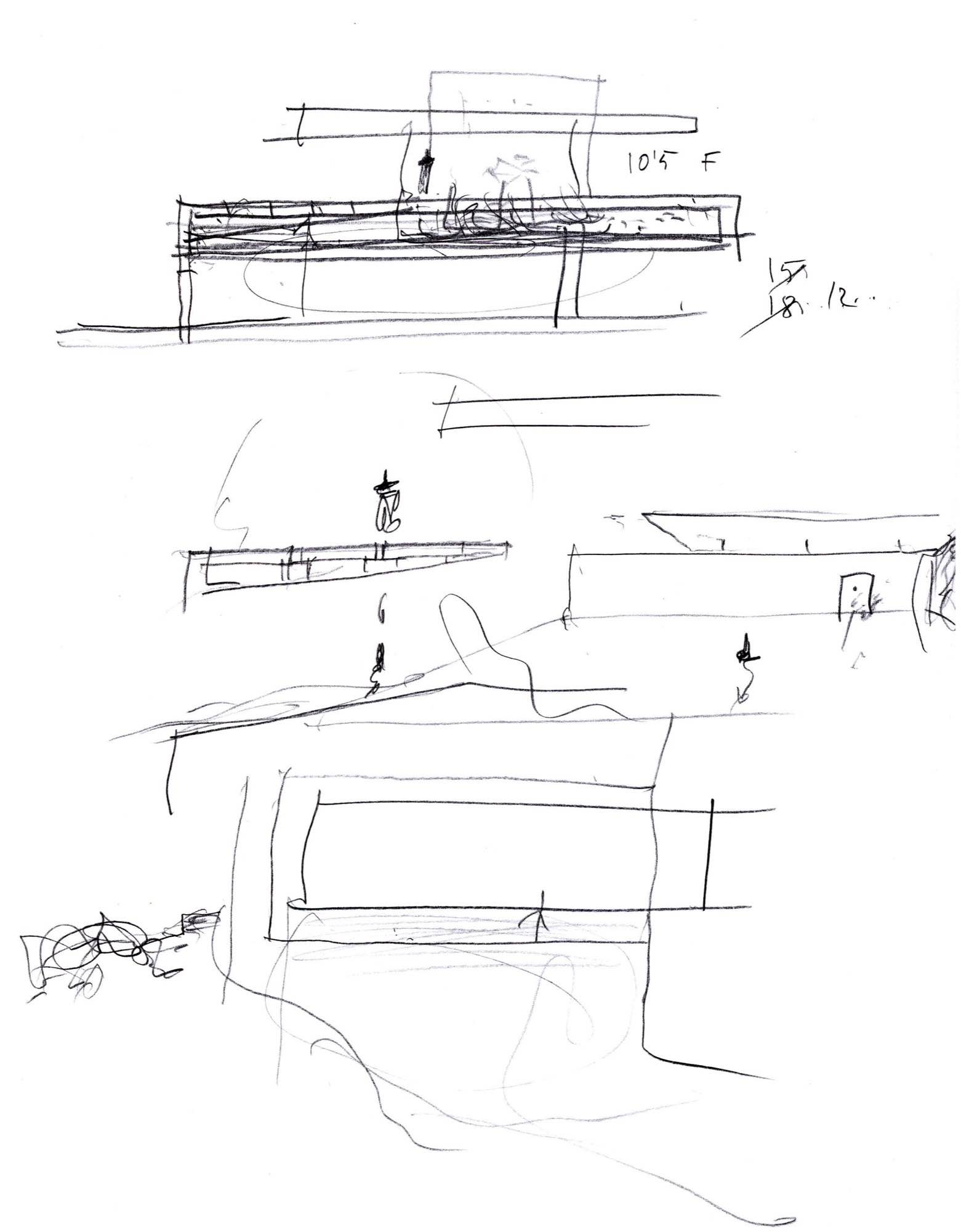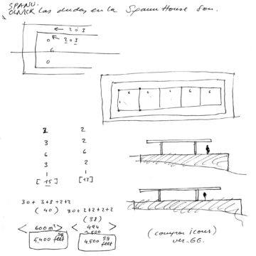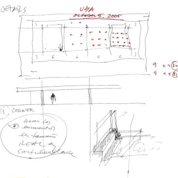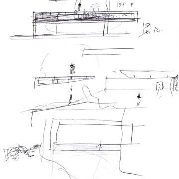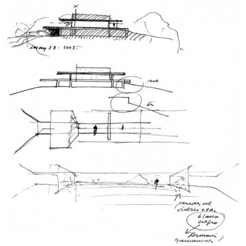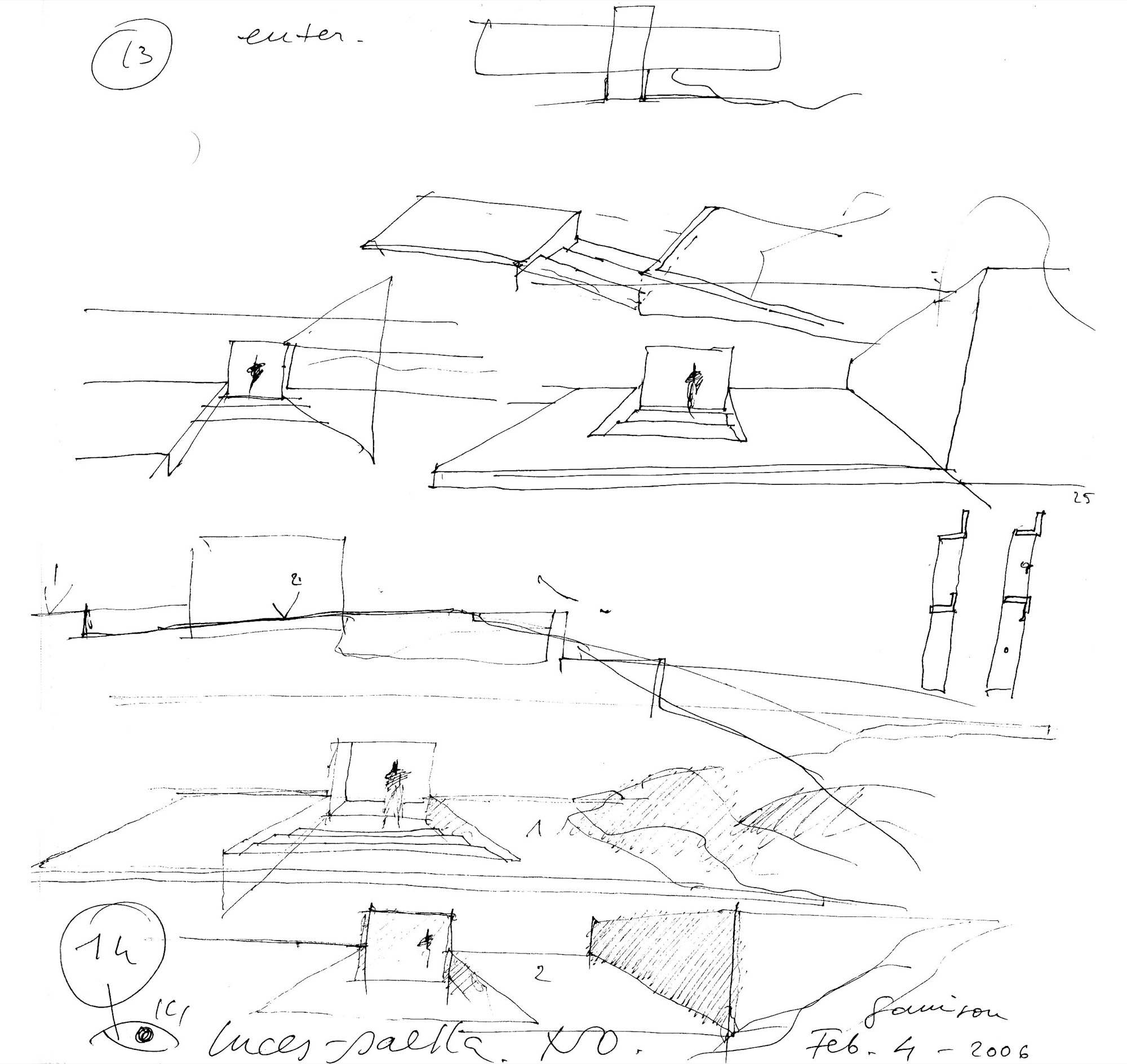 En un lugar de profunda calma donde tras un día de lluvia y niebla, una intensa luz se refleja en la quietud del espejo de las profundas aguas del majestuoso río Hudson. En este impresionante lugar, decidimos establecer un plano, una plataforma, que subrayando el paisaje que aparece frente a nosotros, intentara realzar el paisaje. Construimos una gran caja de 122 pies de largo por 54 pies de ancho por 12 pies de alto. Con recias paredes de hormigón que acentúan su relación con la tierra. La cubierta de esta caja es plana y de piedra, travertino, para establecernos sobre ella.