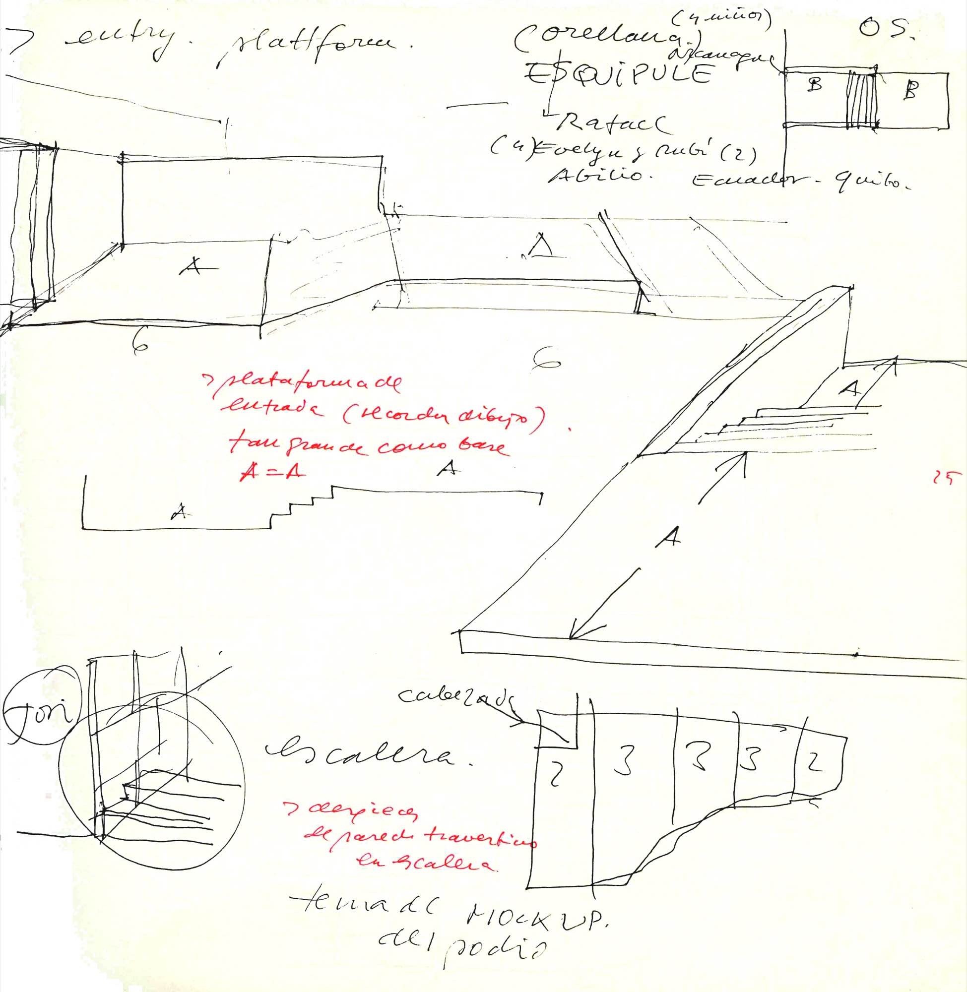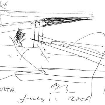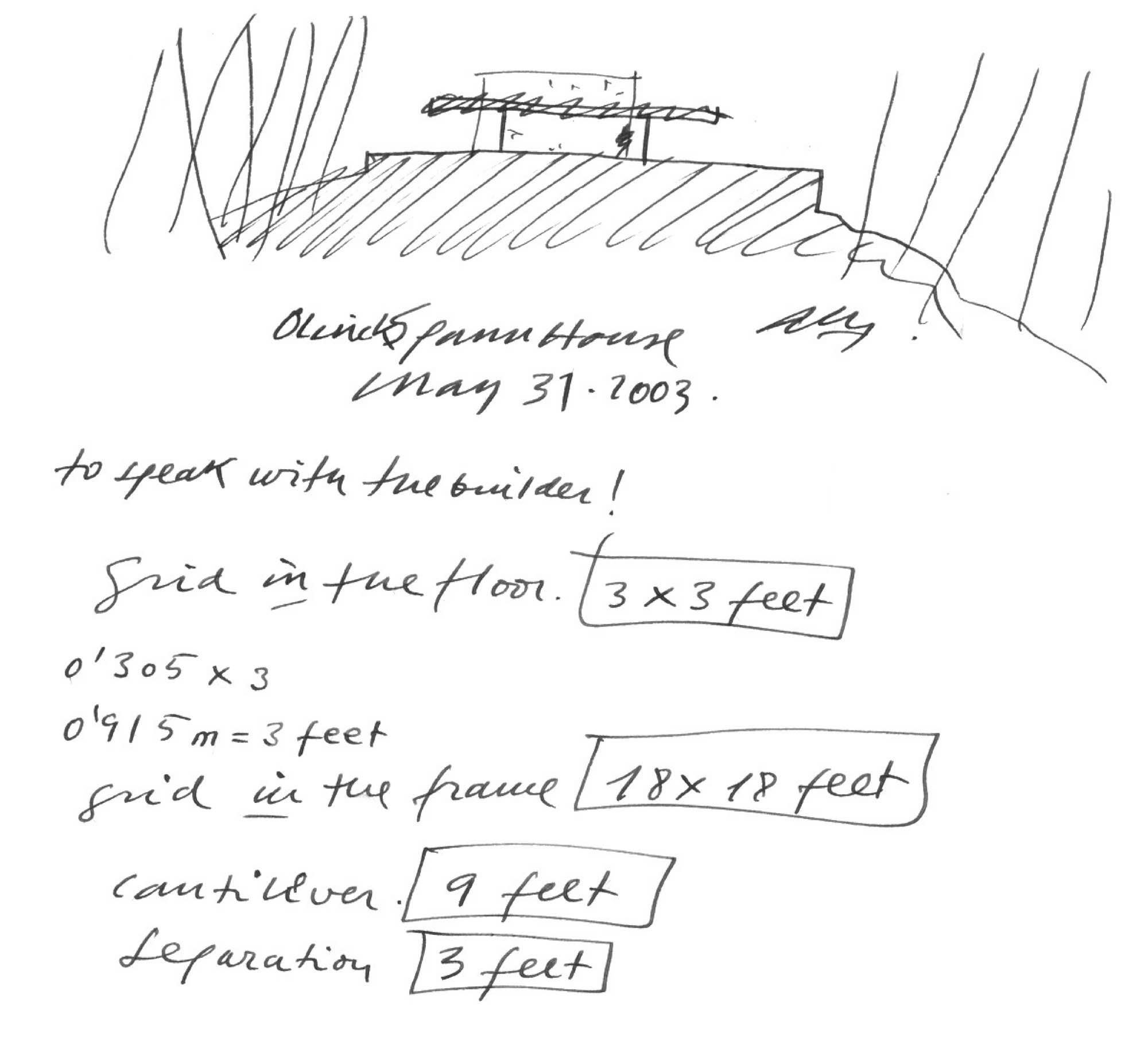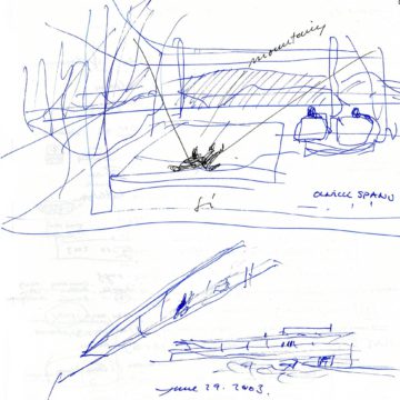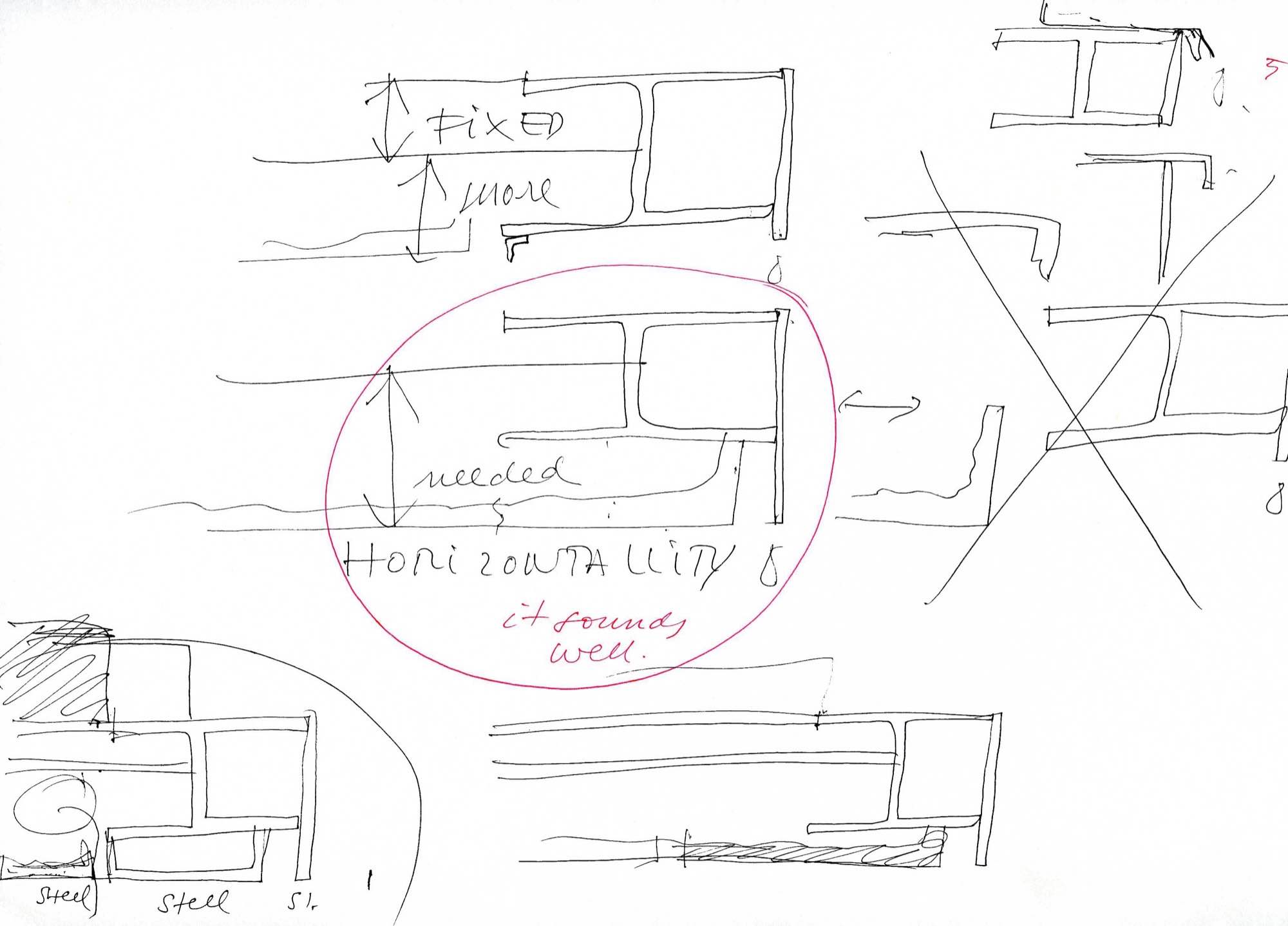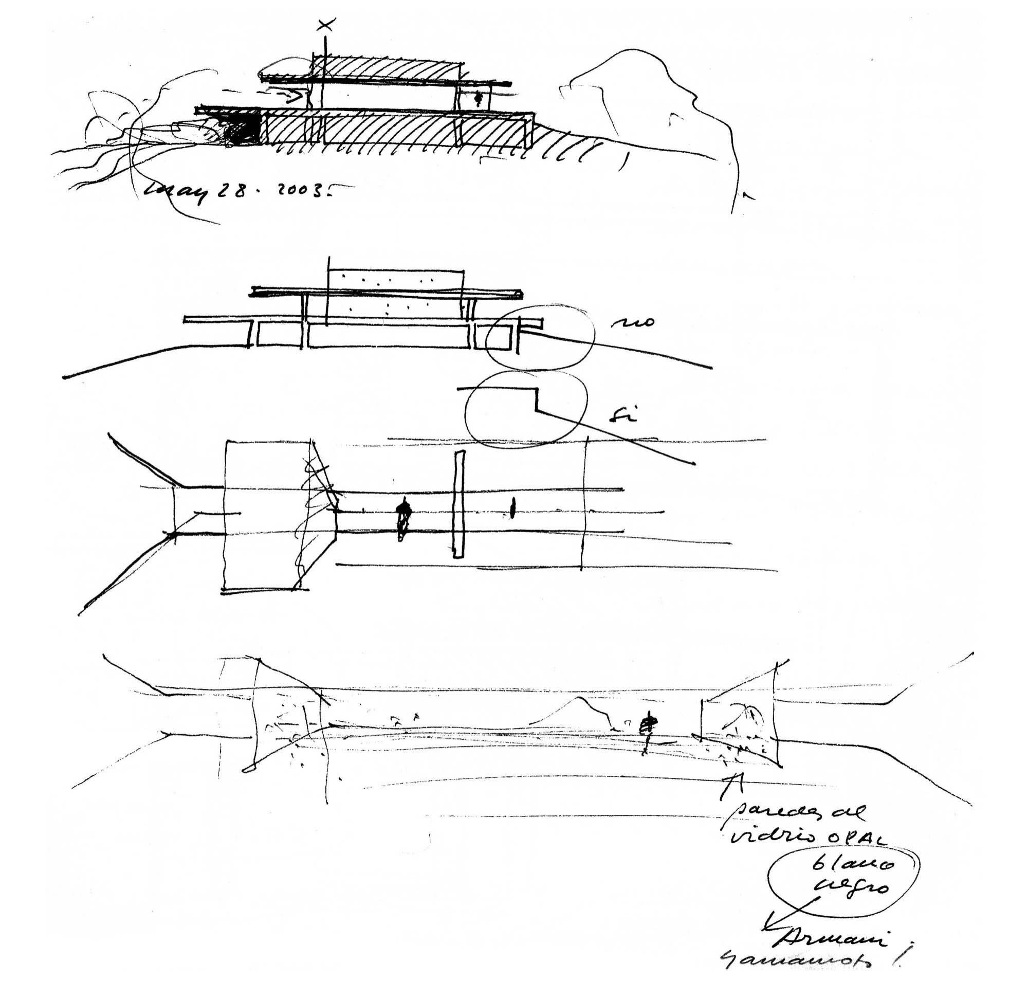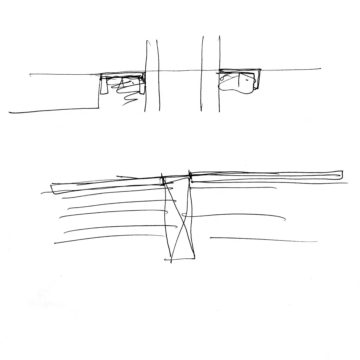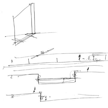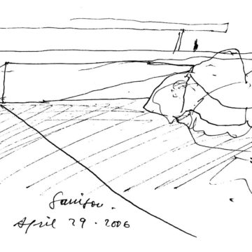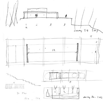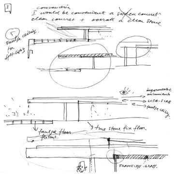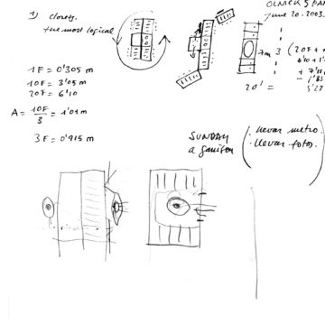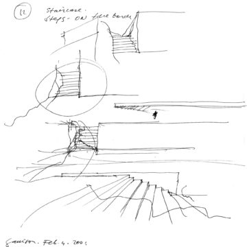 En un lugar de profunda calma donde tras un día de lluvia y niebla, una intensa luz se refleja en la quietud del espejo de las profundas aguas del majestuoso río Hudson. En este impresionante lugar, decidimos establecer un plano, una plataforma, que subrayando el paisaje que aparece frente a nosotros, intentara realzar el paisaje. Construimos una gran caja de 122 pies de largo por 54 pies de ancho por 12 pies de alto. Con recias paredes de hormigón que acentúan su relación con la tierra. La cubierta de esta caja es plana y de piedra, travertino, para establecernos sobre ella.
