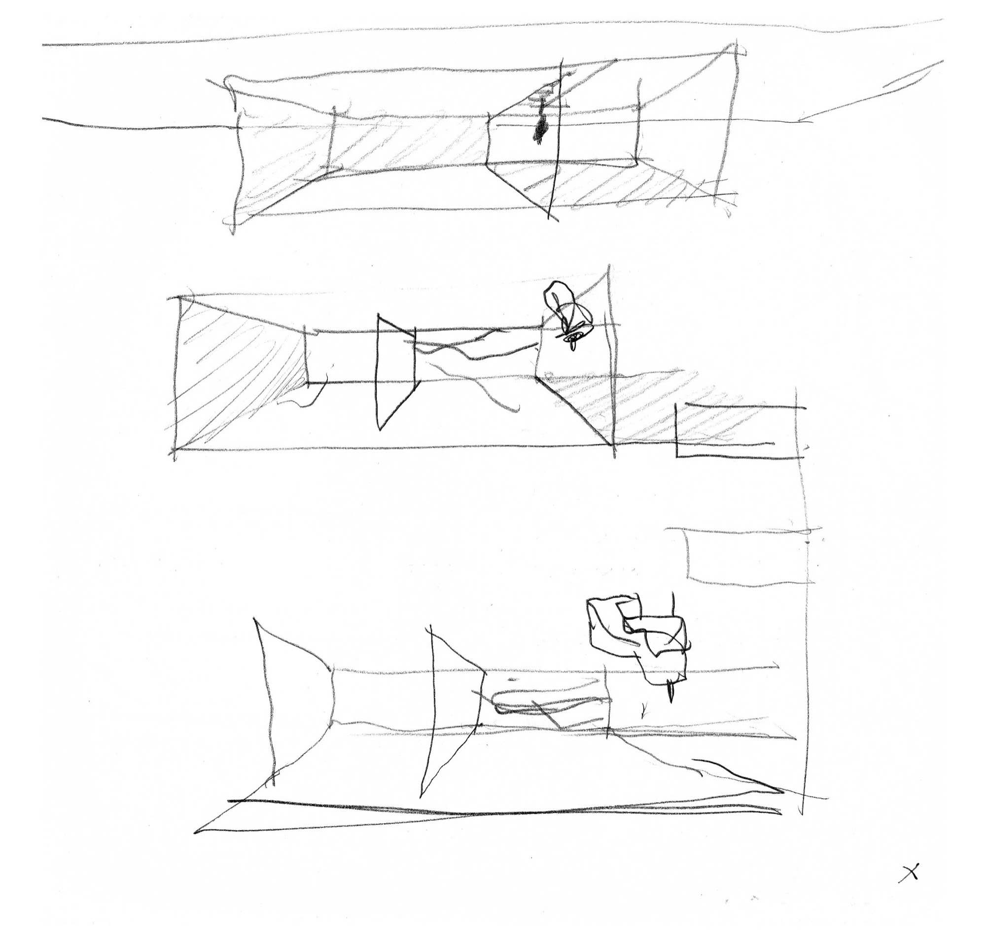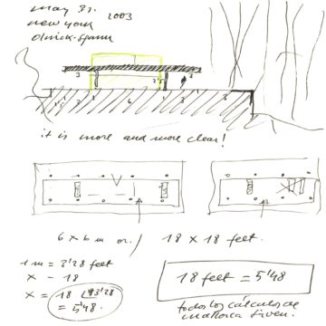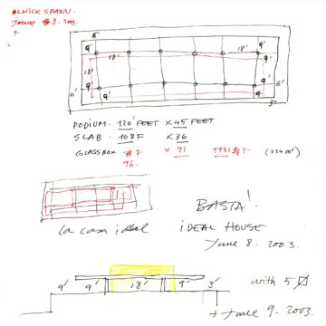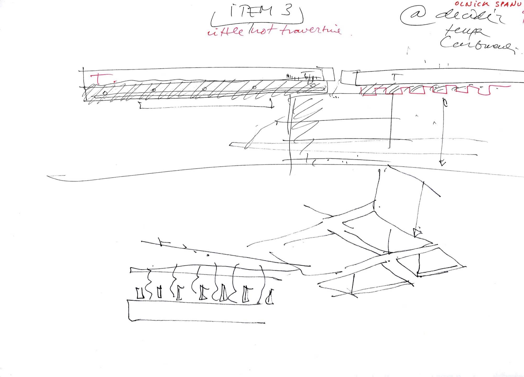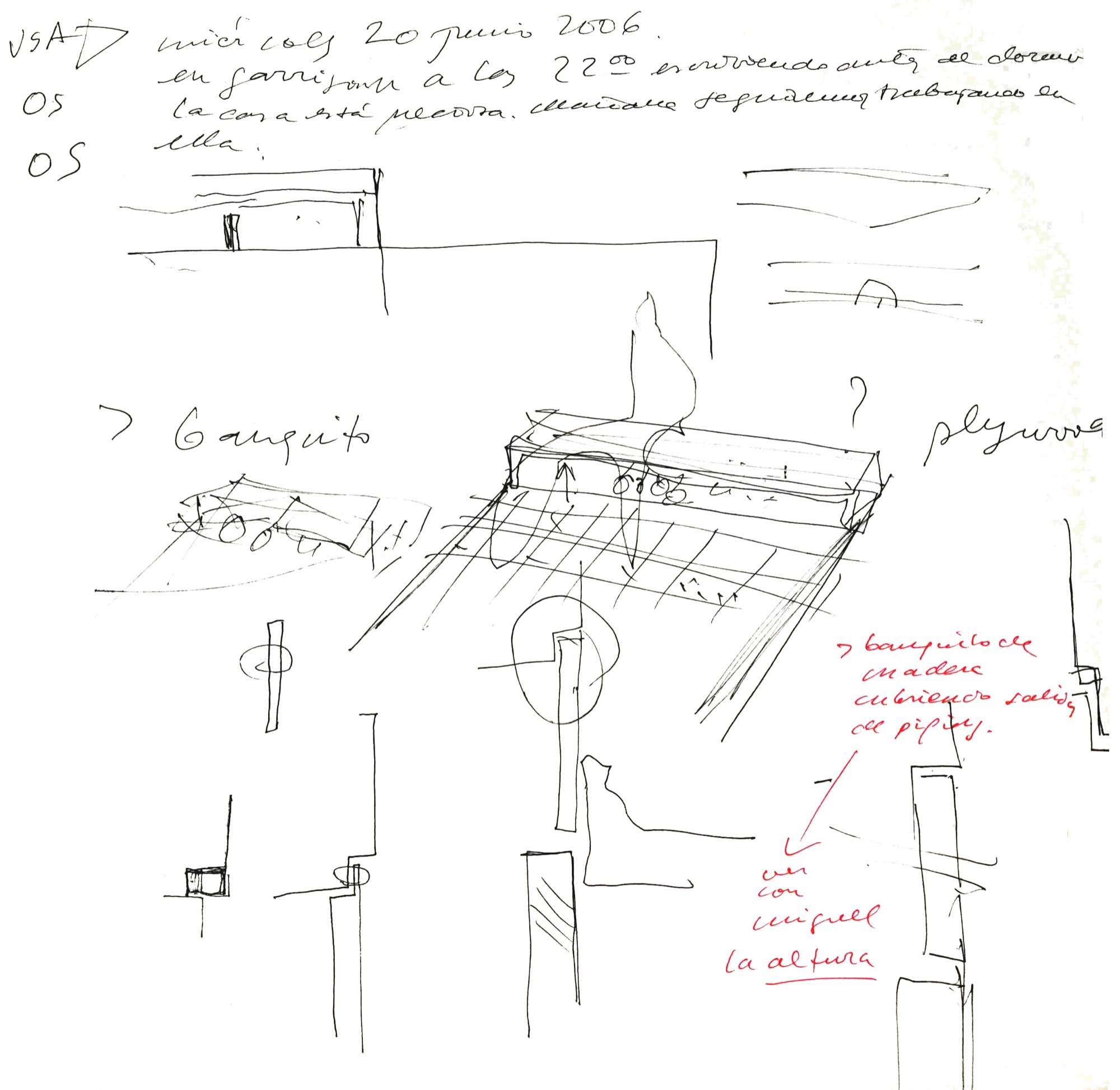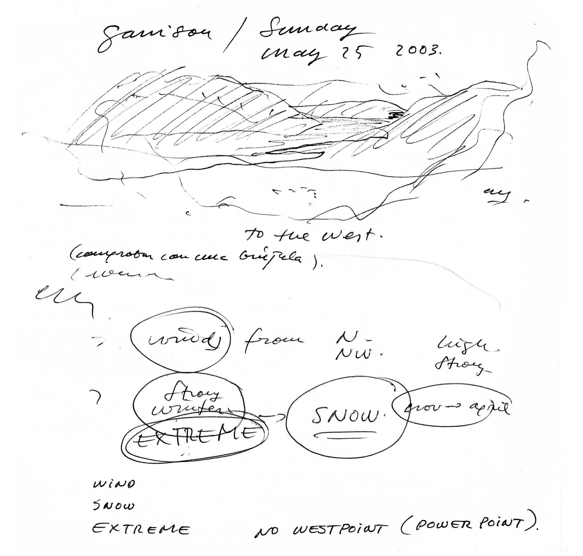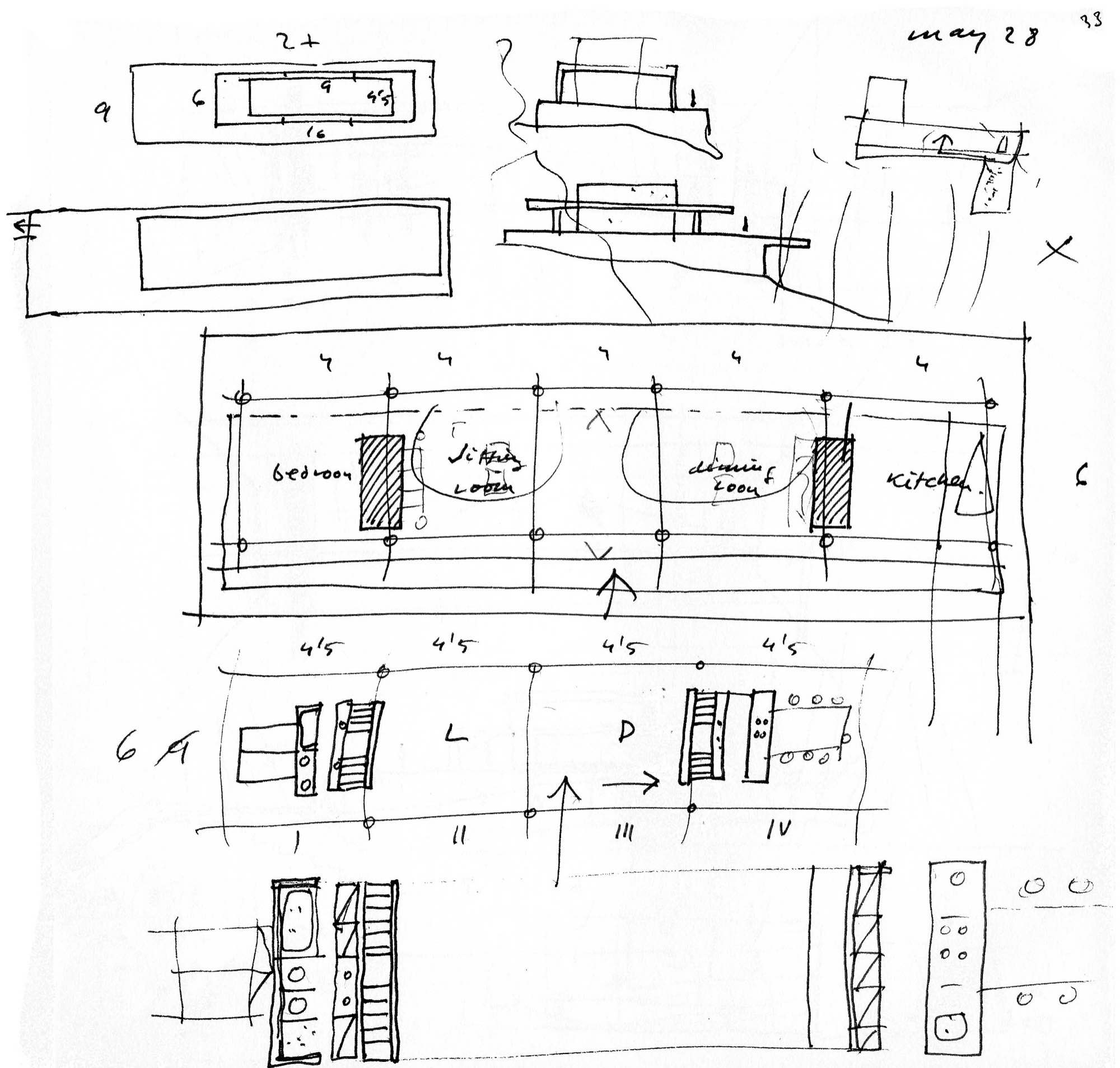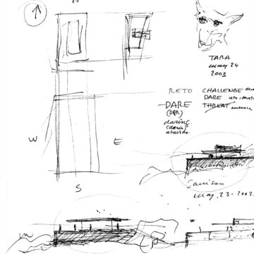 En un lugar de profunda calma donde tras un día de lluvia y niebla, una intensa luz se refleja en la quietud del espejo de las profundas aguas del majestuoso río Hudson. En este impresionante lugar, decidimos establecer un plano, una plataforma, que subrayando el paisaje que aparece frente a nosotros, intentara realzar el paisaje. Construimos una gran caja de 122 pies de largo por 54 pies de ancho por 12 pies de alto. Con recias paredes de hormigón que acentúan su relación con la tierra. La cubierta de esta caja es plana y de piedra, travertino, para establecernos sobre ella.