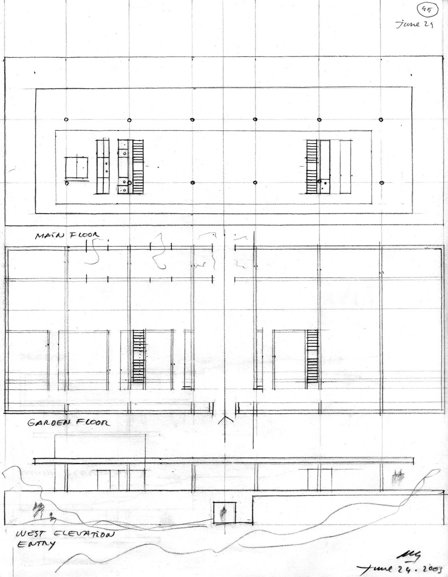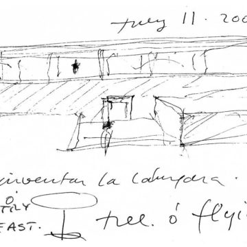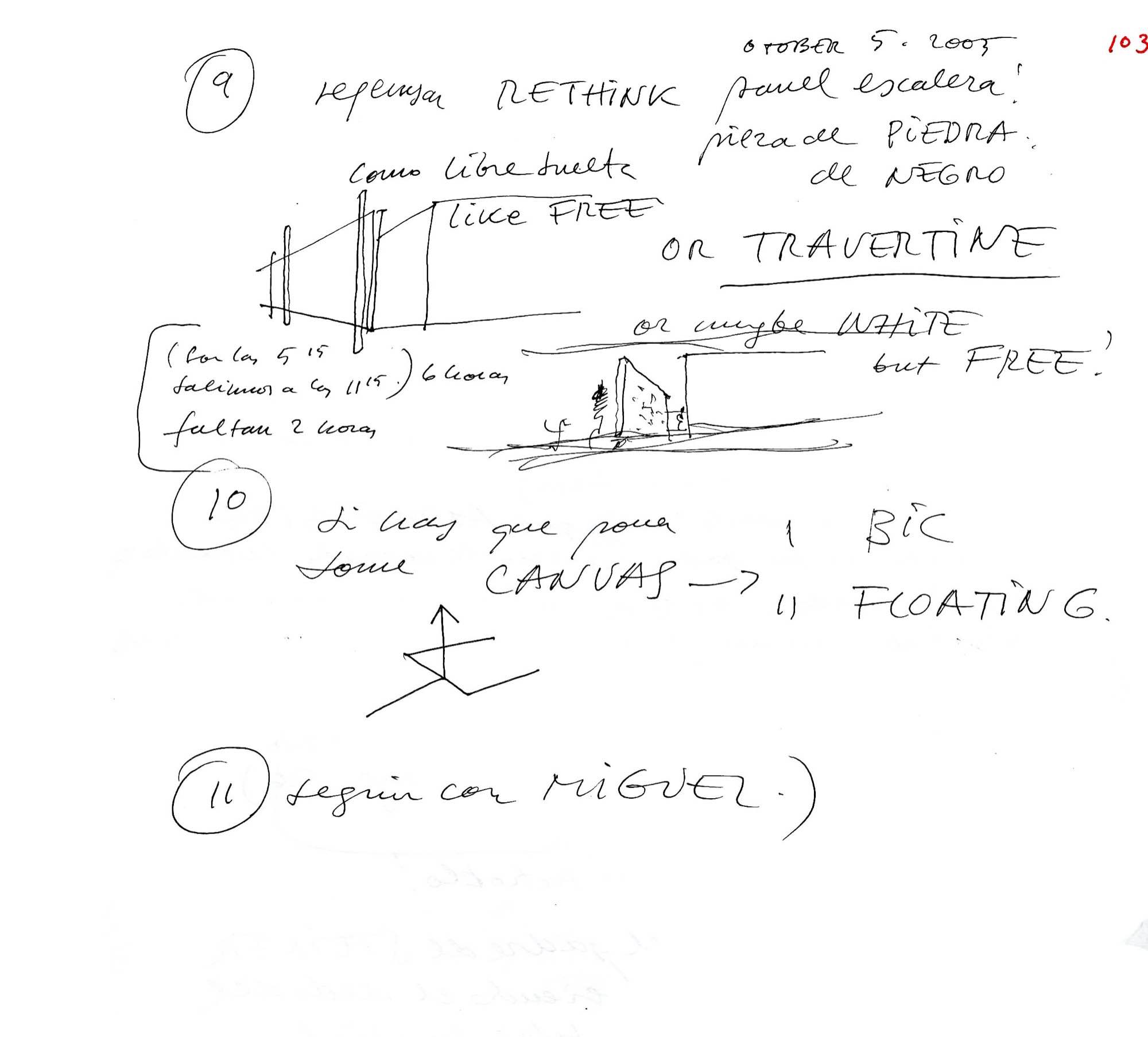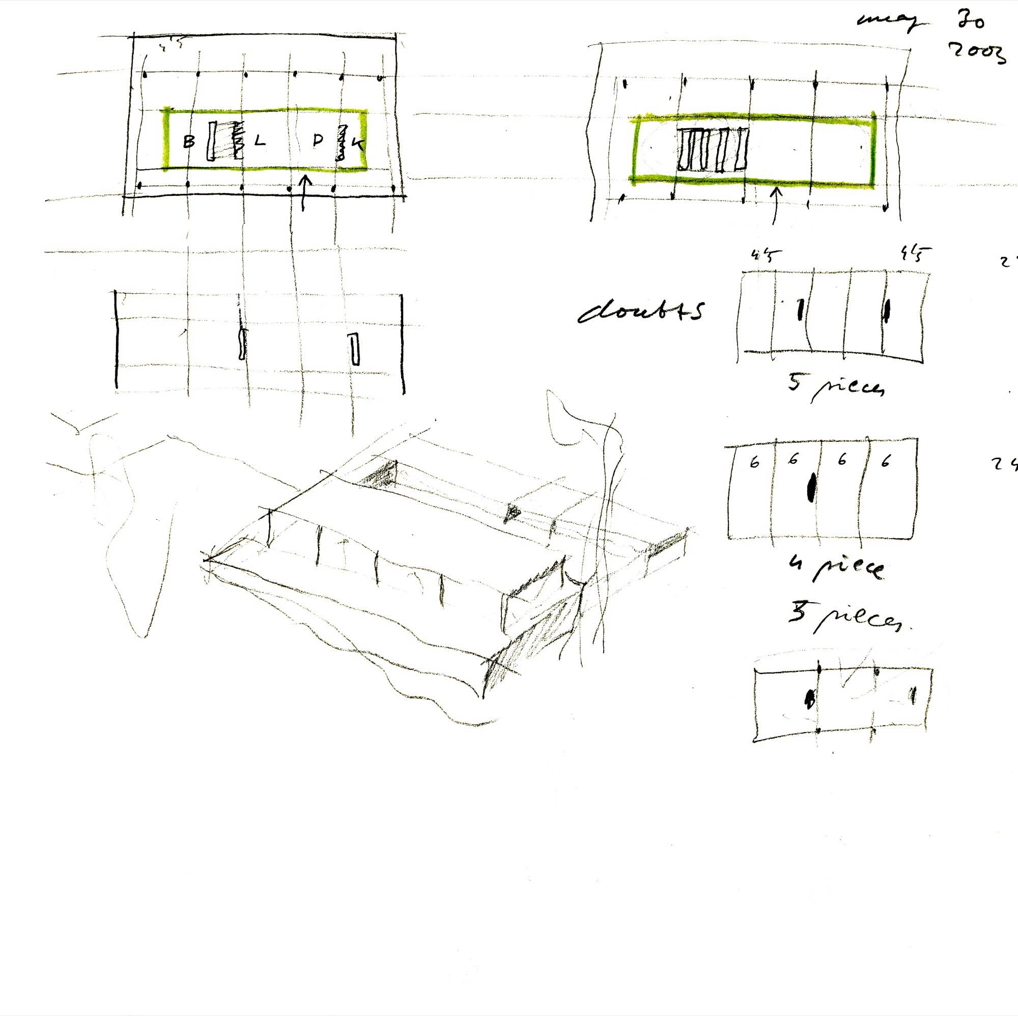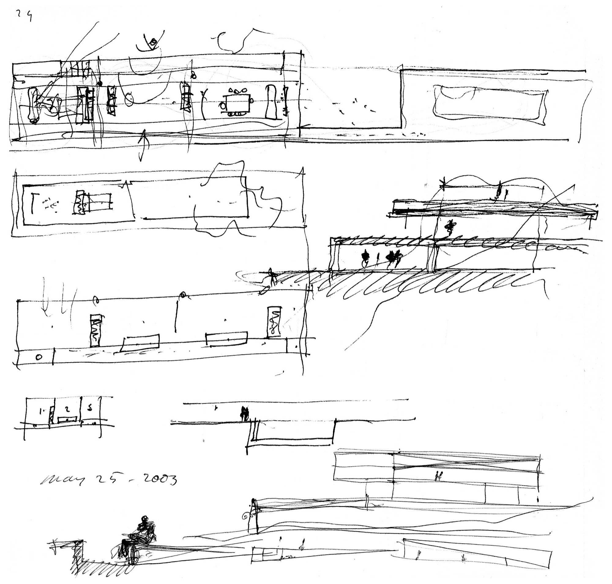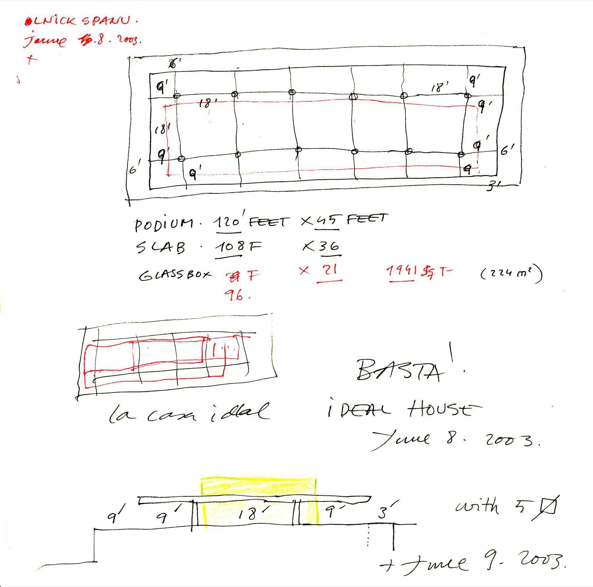 En un lugar de profunda calma donde tras un día de lluvia y niebla, una intensa luz se refleja en la quietud del espejo de las profundas aguas del majestuoso río Hudson. En este impresionante lugar, decidimos establecer un plano, una plataforma, que subrayando el paisaje que aparece frente a nosotros, intentara realzar el paisaje. Construimos una gran caja de 122 pies de largo por 54 pies de ancho por 12 pies de alto. Con recias paredes de hormigón que acentúan su relación con la tierra. La cubierta de esta caja es plana y de piedra, travertino, para establecernos sobre ella.
