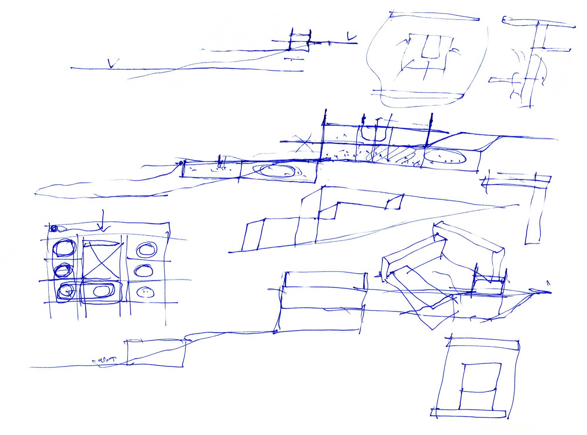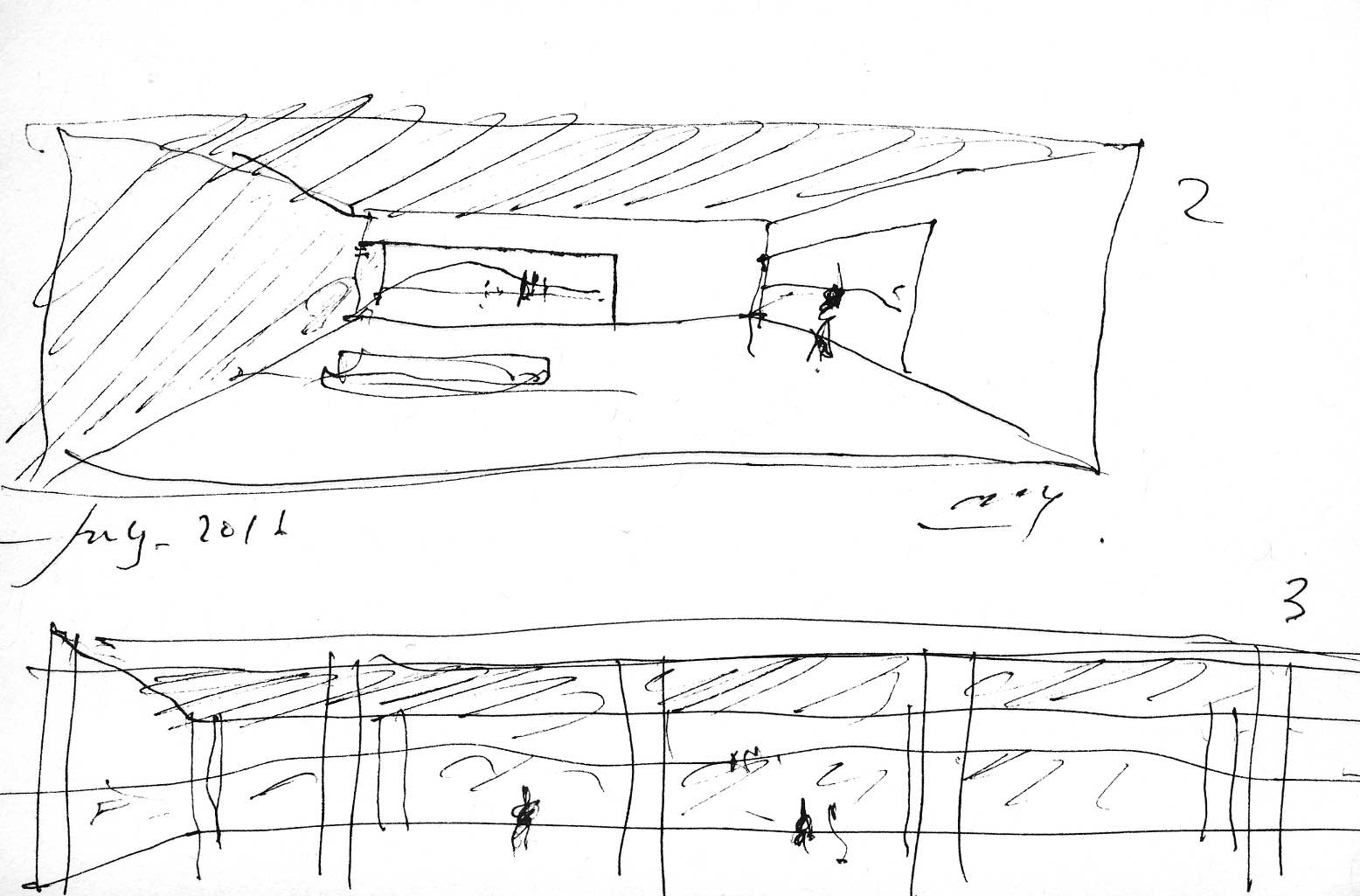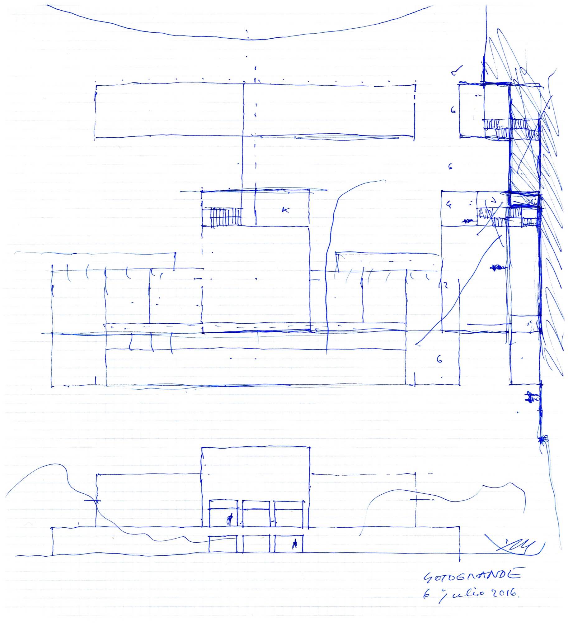El primer nivel es el de la calle, en el que se sitúa el área de garaje y aparcamiento. Debajo las zonas de vivienda de servicio y anexos sobre la primera plataforma.