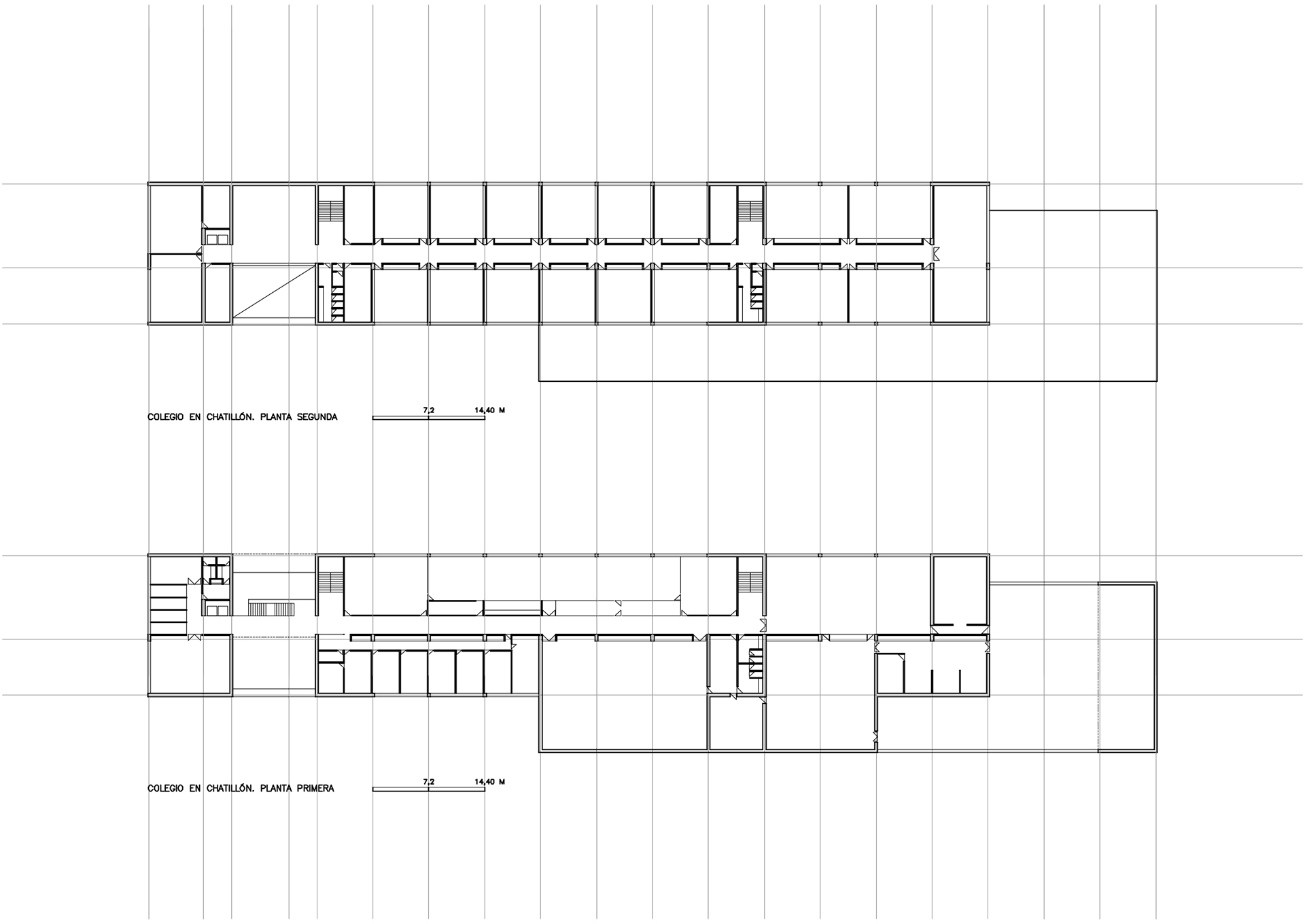 Para este edificio escolar para 700 alumnos se adopta el esquema en espina de pez, con pasillo central y aulas a ambos lados. En los extremos se sitúan los espacios comunes.