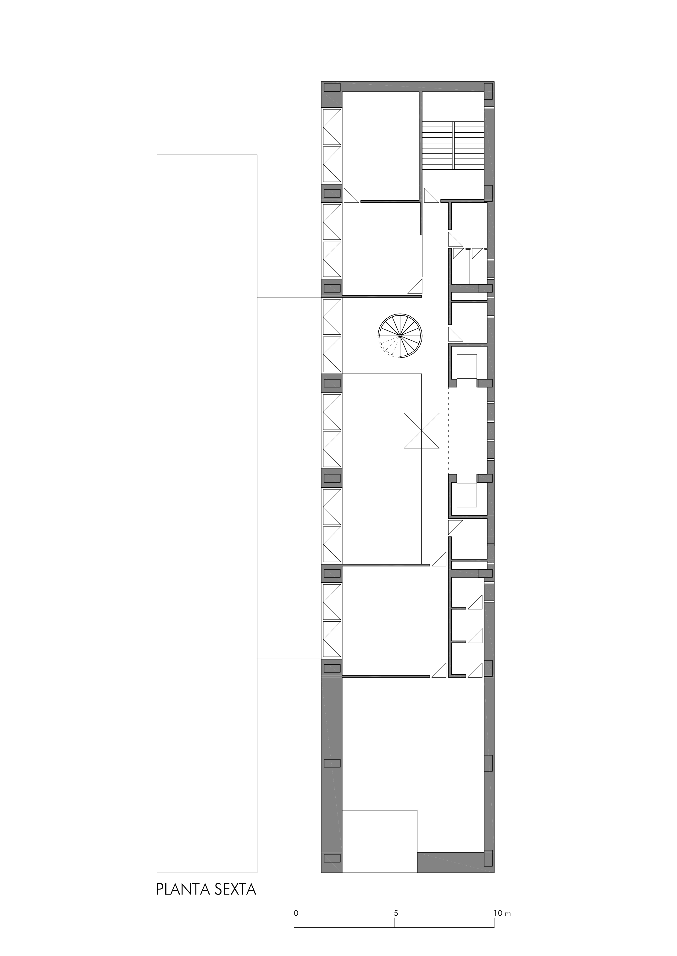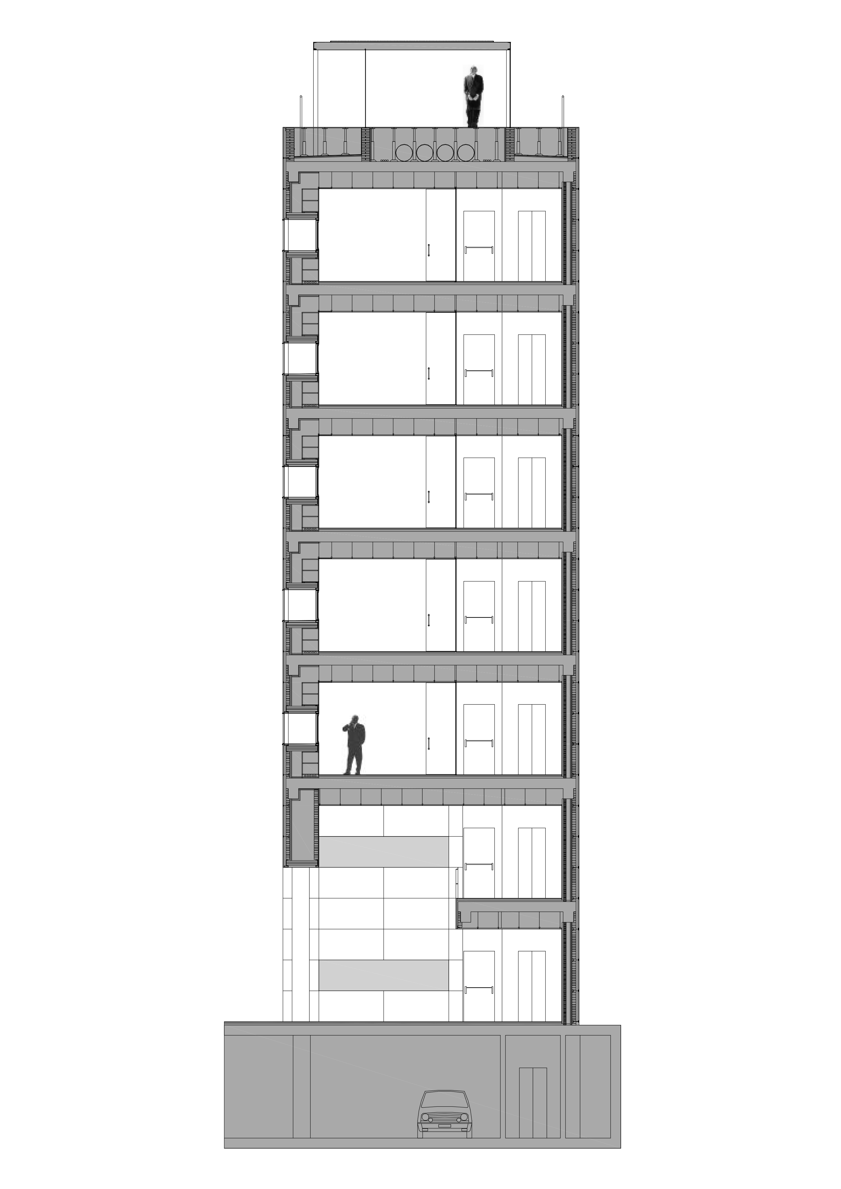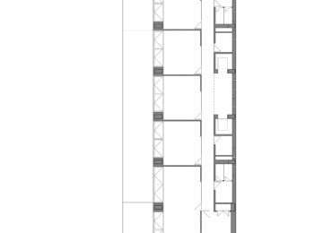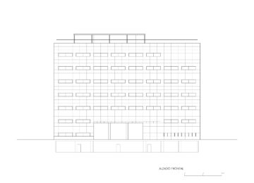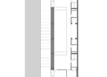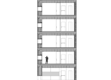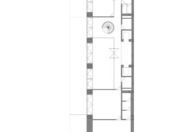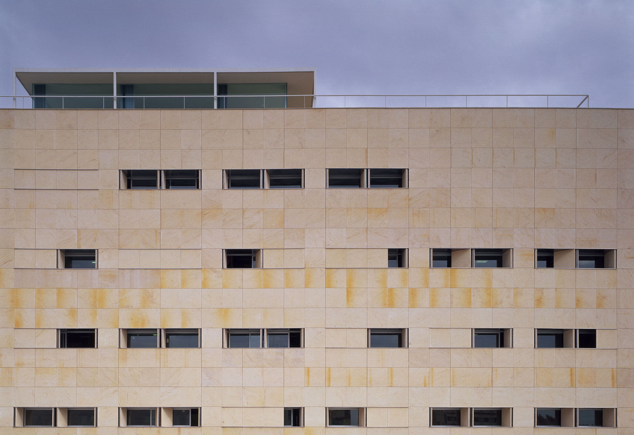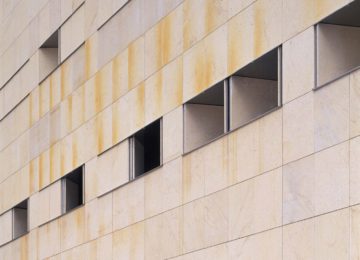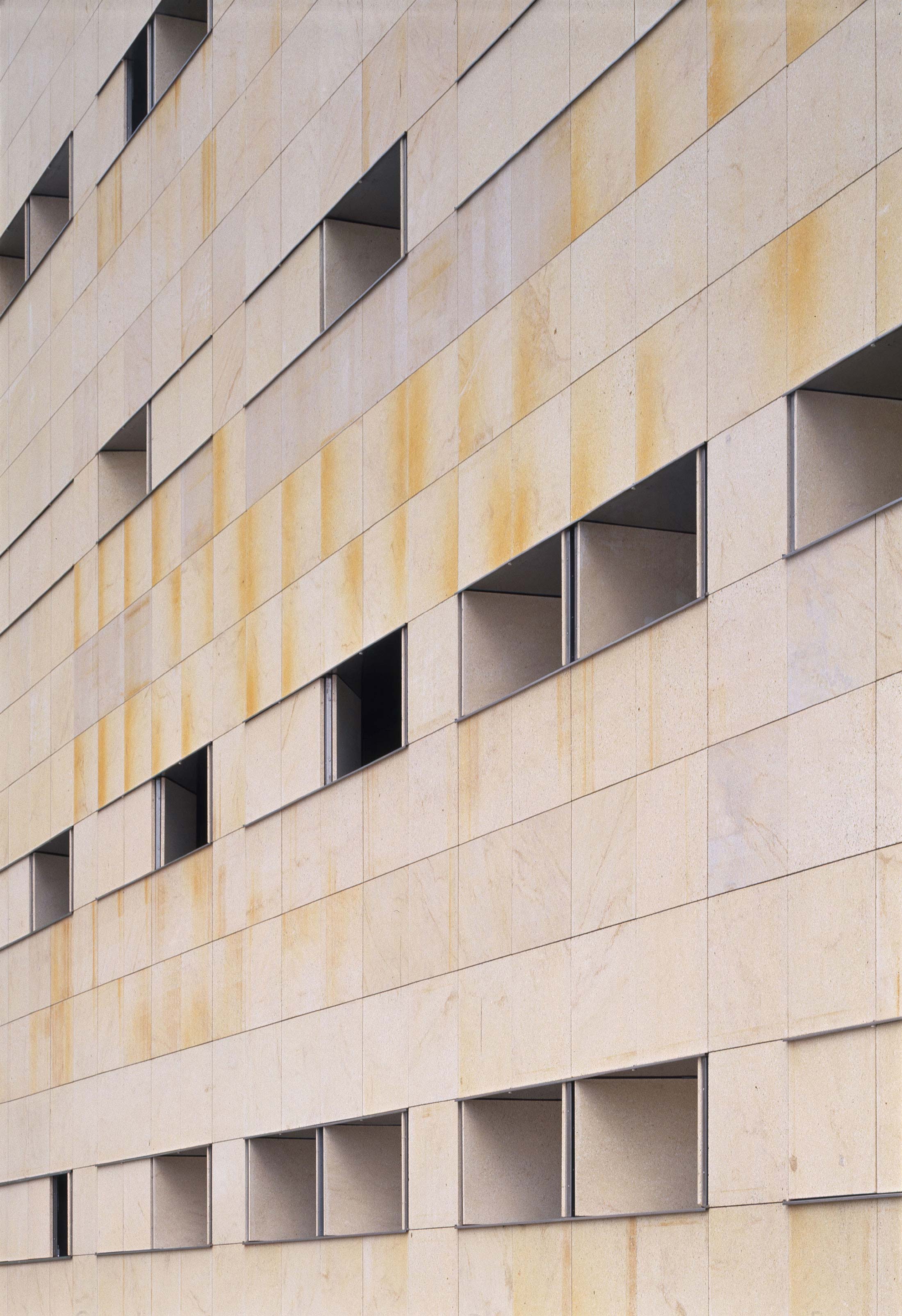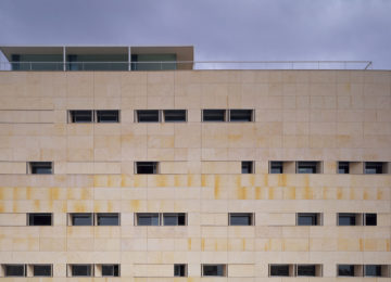 On an elongated site measuring 40 x 8.5 m with a maximum height of 7 floors, the offices were built as a single volume. A straight rectangular parallelepiped was built entirely in stone. The thick walls contain closets and storage. The windows are double. Inside, glazed. Outside, the project’s most unique aspect, are shutters made of stone to regulate the light that enters the rooms. When all of the shutters are closed, the parallelepiped appears as a solid stone box.