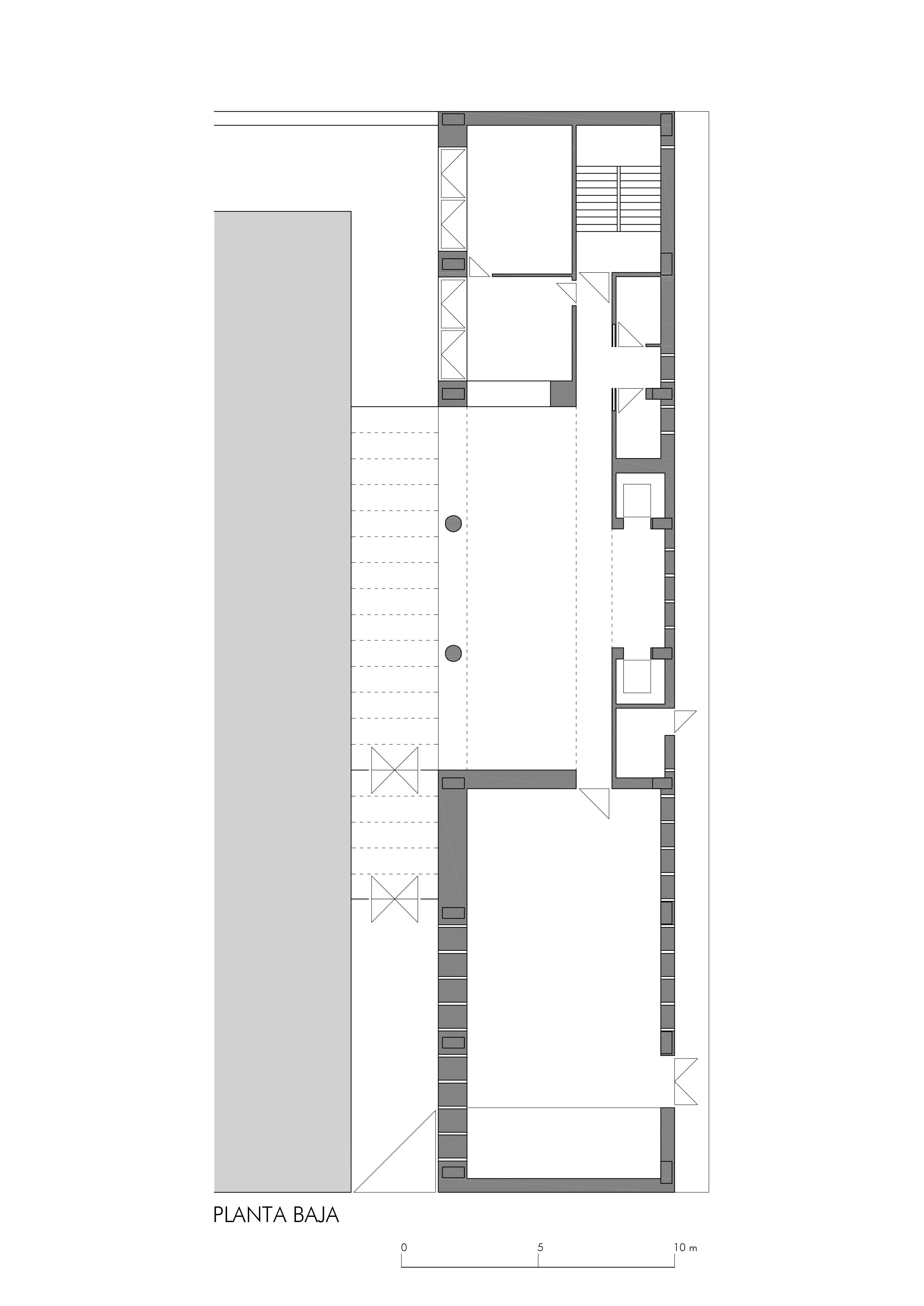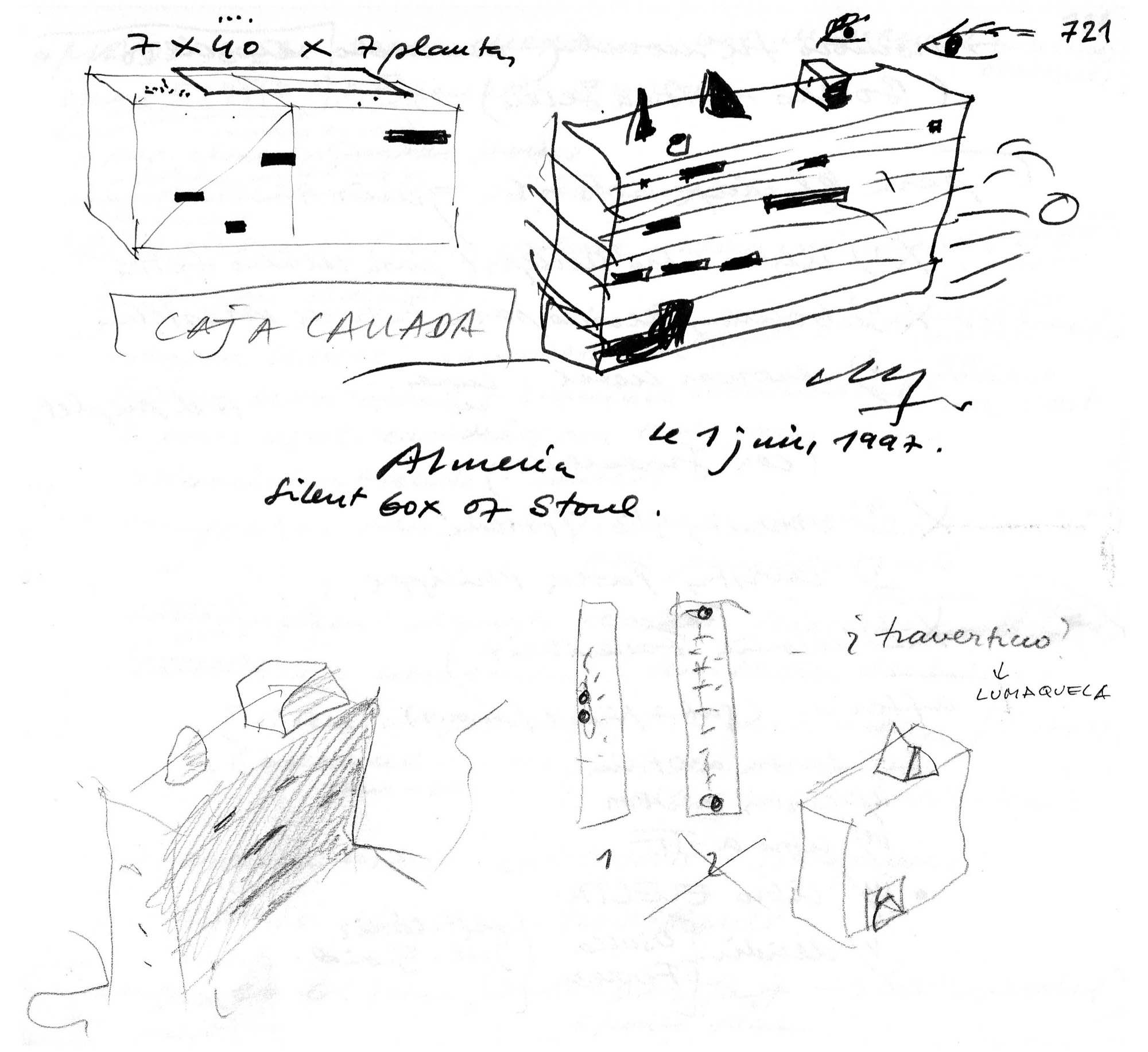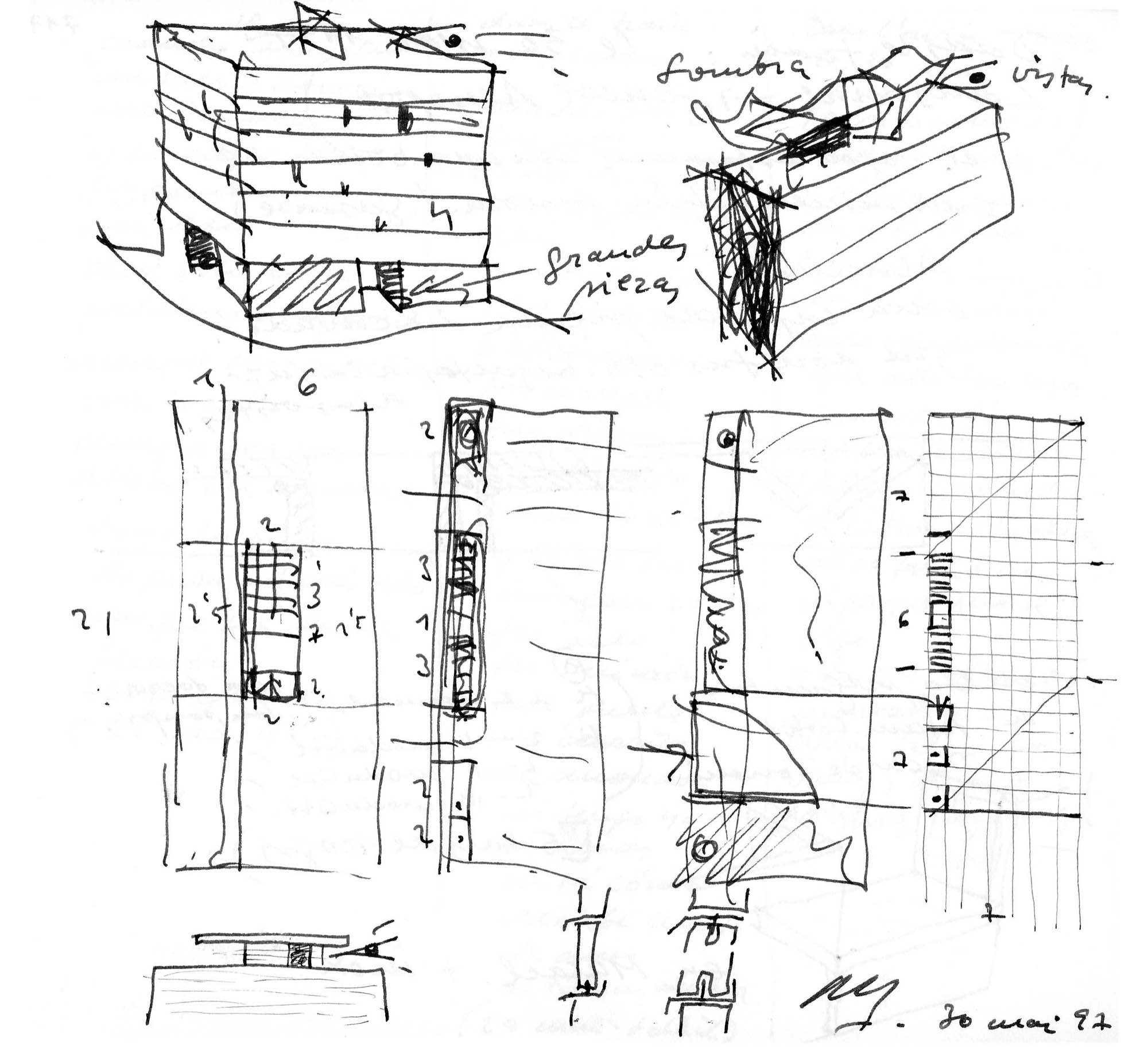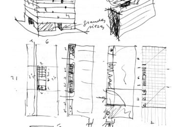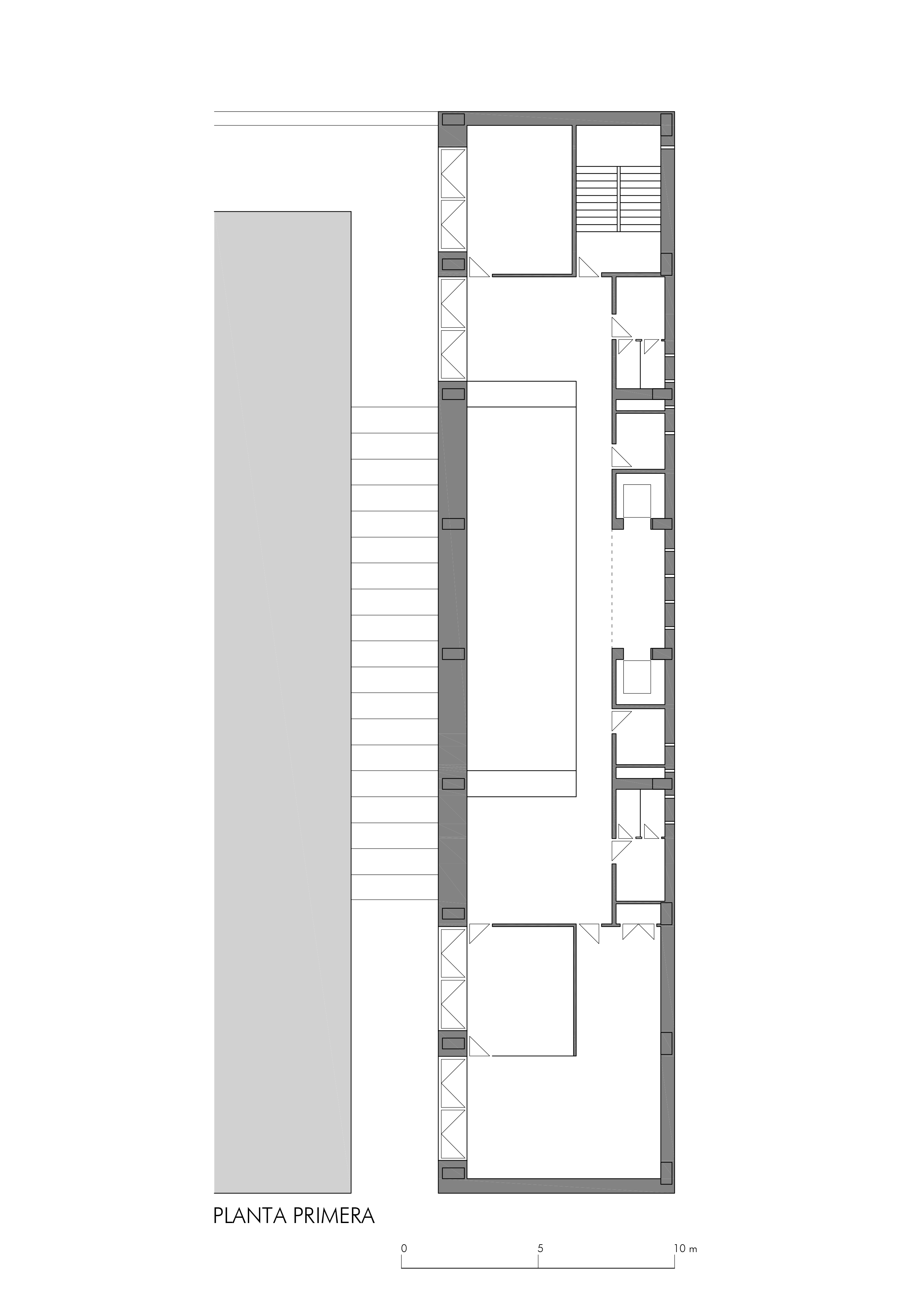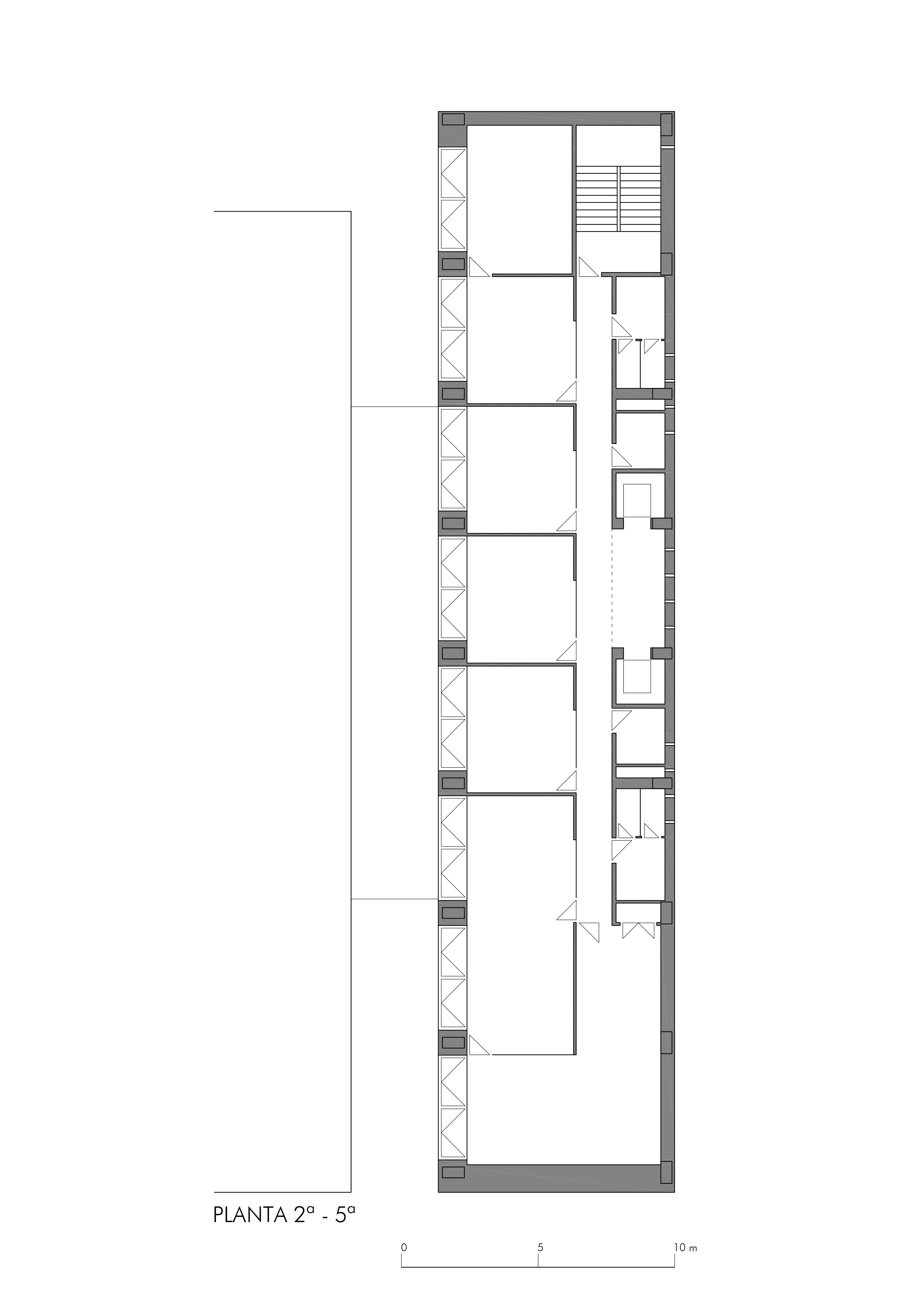 On an elongated site measuring 40 x 8.5 m with a maximum height of 7 floors, the offices were built as a single volume. A straight rectangular parallelepiped was built entirely in stone. The thick walls contain closets and storage. The windows are double. Inside, glazed. Outside, the project’s most unique aspect, are shutters made of stone to regulate the light that enters the rooms. When all of the shutters are closed, the parallelepiped appears as a solid stone box.